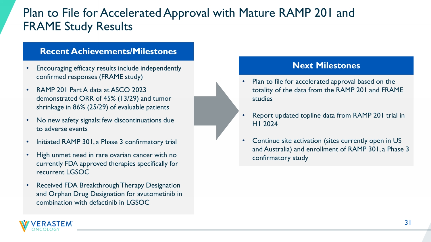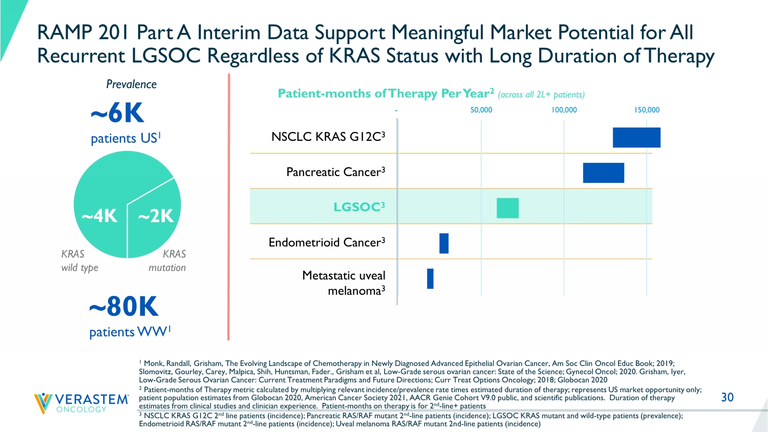 30 RAMP 201 Part A Interim Data Support Meaningful Market Potential for All Recurrent LGSOC Regardless of KRAS Status with Long Duration of Therapy NSCLC KRAS G12C 3 Pancreatic Cancer 3 LGSOC 3 Endometrioid Cancer 3 Metastatic uveal melanoma 3 ~6K patients US 1 ~80K patients WW 1 Patient - months of Therapy Per Year 2 (across all 2L+ patients) 1 Monk, Randall, Grisham, The Evolving Landscape of Chemotherapy in Newly Diagnosed Advanced Epithelial Ovarian Cancer, Am Soc Cl in Oncol Educ Book; 2019; Slomovitz, Gourley, Carey, Malpica, Shih, Huntsman, Fader., Grisham et al, Low - Grade serous ovarian cancer: State of the Science ; Gynecol Oncol; 2020. Grisham, Iyer, Low - Grade Serous Ovarian Cancer: Current Treatment Paradigms and Future Directions; Curr Treat Options Oncology; 2018; Globocan 2020 2 Patient - months of Therapy metric calculated by multiplying relevant incidence/prevalence rate times estimated duration of thera py; represents US market opportunity only; patient population estimates from Globocan 2020, American Cancer Society 2021, AACR Genie Cohort V9.0 public, and scientific pub lications. Duration of therapy estimates from clinical studies and clinician experience. Patient - months on therapy is for 2 nd - line+ patients 3 NSCLC KRAS G12C 2 nd line patients (incidence); Pancreatic RAS/RAF mutant 2 nd - line patients (incidence); LGSOC KRAS mutant and wild - type patients (prevalence); Endometrioid RAS/RAF mutant 2 nd - line patients (incidence); Uveal melanoma RAS/RAF mutant 2nd - line patients (incidence) Prevalence - 50,000 100,000 150,000 ~ 4K ~ 2K KRAS wild type KRAS mutation