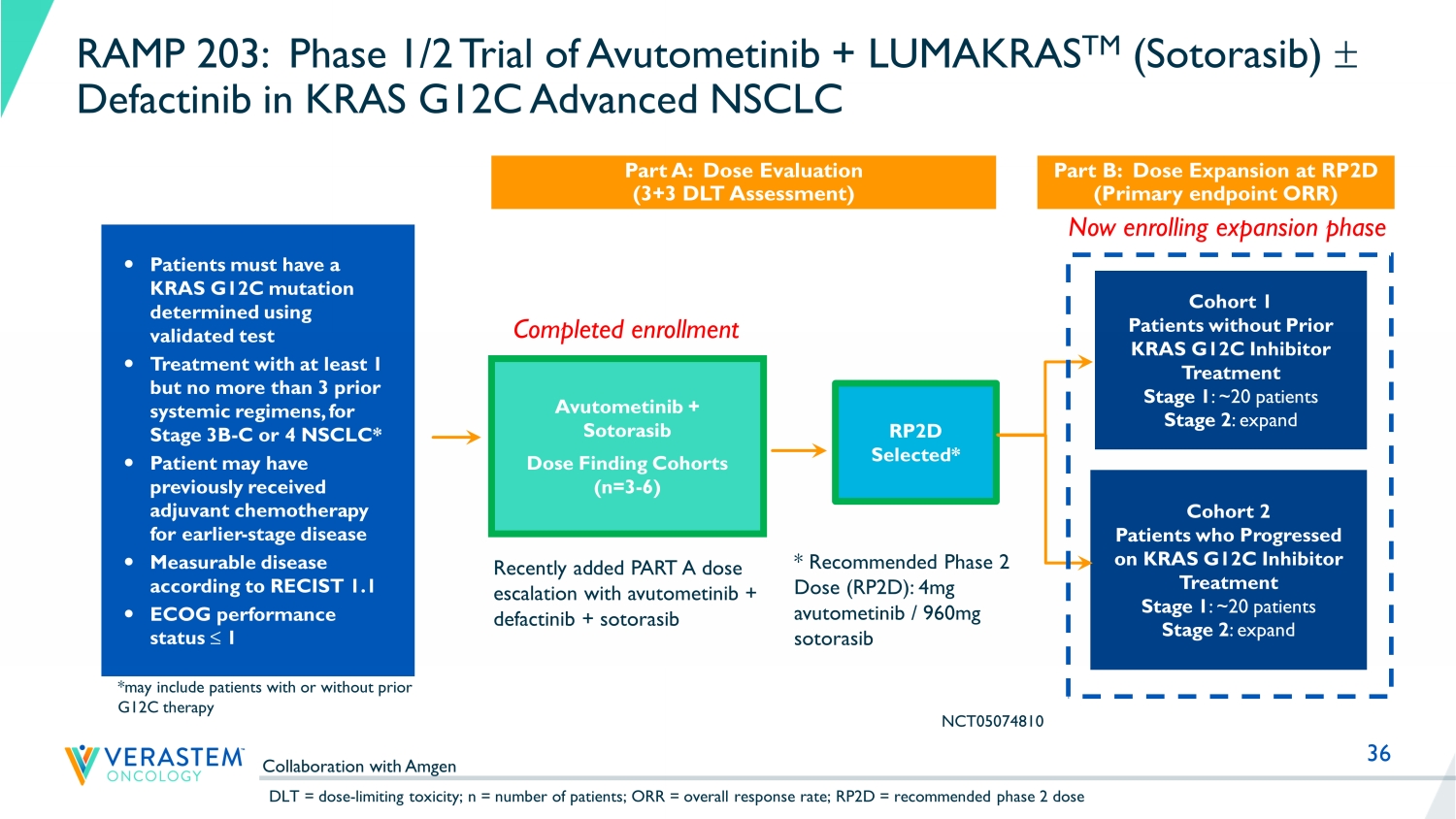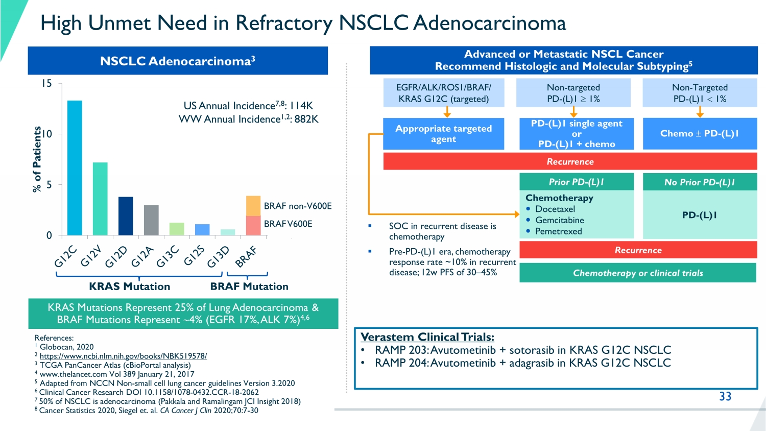 33 High Unmet Need in Refractory NSCLC Adenocarcinoma Advanced or Metastatic NSCL Cancer Recommend Histologic and Molecular Subtyping 5 Appropriate targeted agent Chemotherapy Docetaxel Gemcitabine Pemetrexed Prior PD - (L)1 No Prior PD - (L)1 PD - (L)1 Chemo PD - (L)1 PD - (L)1 single agent or PD - (L)1 + chemo Chemotherapy or clinical trials EGFR/ALK/ROS1/BRAF/ KRAS G12C (targeted) Non - targeted PD - (L)1 1% Non - Targeted PD - (L)1 1% ▪ SOC in recurrent disease is chemotherapy ▪ Pre - PD - (L)1 era, chemotherapy response rate ~10% in recurrent disease; 12w PFS of 30 – 45% Recurrence Recurrence Verastem Clinical Trials: • RAMP 203: Avutometinib + sotorasib in KRAS G12C NSCLC • RAMP 204: Avutometinib + adagrasib in KRAS G12C NSCLC NSCLC Adenocarcinoma 3 0 5 10 15 % of Patients KRAS Mutation BRAF Mutation US Annual Incidence 7,8 : 114K WW Annual Incidence 1,2 : 882K References: 1 Globocan, 2020 2 https://www.ncbi.nlm.nih.gov/books/NBK519578/ 3 TCGA PanCancer Atlas (cBioPortal analysis) 4 www.thelancet.com Vol 389 January 21, 2017 5 Adapted from NCCN Non - small cell lung cancer guidelines Version 3.2020 6 Clinical Cancer Research DOI 10.1158/1078 - 0432.CCR - 18 - 2062 7 50% of NSCLC is adenocarcinoma (Pakkala and Ramalingam JCI Insight 2018) ​ 8 Cancer Statistics 2020, Siegel et. al. CA Cancer J Clin 2020;70:7 - 30 KRAS Mutations Represent 25% of Lung Adenocarcinoma & BRAF Mutations Represent 4% (EGFR 17%, ALK 7%) 4,6 BRAF V600E BRAF non - V600E