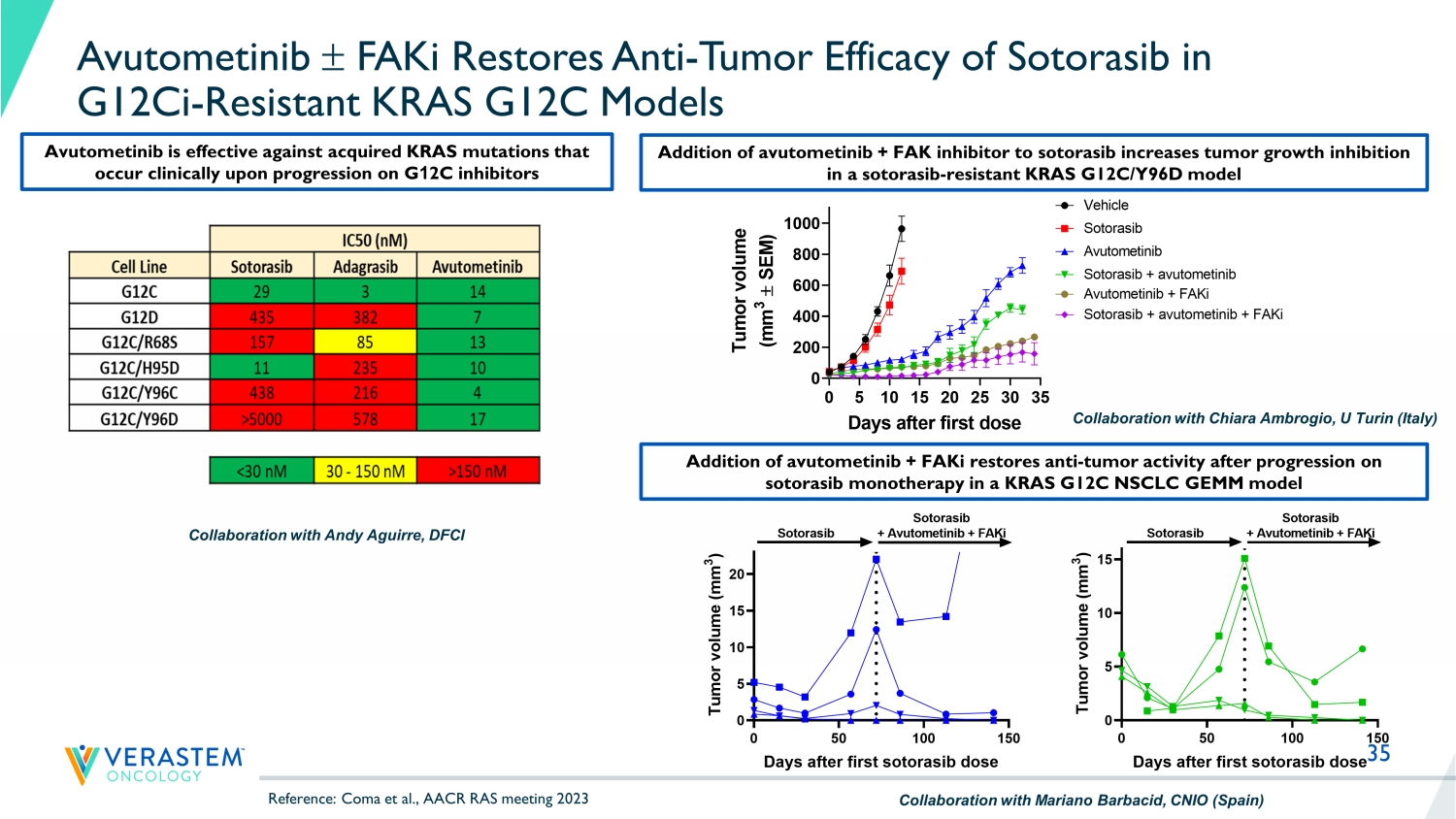 34 0 10 20 30 0 500 1000 1500 2000 Tumor growth Days after first dose T u m o r v o l u m e ( m m 3 + / - S E M ) vehicle sotorasib sotorasib + avutometinib sotorasib + avutometinib + FAKi avutometinib trametinib **** **** **** Preclinical Synergy of Avutometinib + G12C Inhibitors in KRAS G12C Models Synergy of avutometinib + G12C inhibitors across G12C mutant NSCLC, CRC & Pancreatic cancer cell lines Doses Tested Sotorasib: 30 mg/kg PO QD Avutometinib: 0.3 mg/kg PO QD FAKi: 50 mg/kg PO BID Trametinib: 0.3 mg/kg PO QD Avutometinib & FAKi potentiate sotorasib efficacy in KRAS G12C NSCLC in vivo; Tumor regression in all mice with triple combination Avutometinib + sotorasib yields deeper and more sustained inhibition of ERK signaling pathway H2122 KRAS G12C NSCLC Sotorasib Avutometinib 4h 48h p - ERK Actin Total ERK ND: not determined - - + - - + + + - - + - - + + + H2122 KRAS G12C NSCLC Concentrations Tested Sotorasib: 100 nM Avutometinib: 100 nM Reference: Coma et al., AACR 2021 Combined Synergy Score Cell line Indication Sensitivity to G12C inhibitors Avutometinib + sotorasib Avutometinib + adagrasib H2122 NSCLC Moderately sensitive 44.7 44.6 H1373 NSCLC Sensitive 10.0 3.4 SW1573 NSCLC Insensitive 8.6 12.0 H358 NSCLC Sensitive 6.9 5.4 H2030 NSCLC Moderately sensitive 5.1 ND SW837 CRC Sensitive 16.1 18.5 MIAPACA2 Panc Sensitive 2.3 5.3 -100 0 100 200 300 400 Response at Day 10 R e s p o n s e @ D a y 1 0 ( % c h a n g e f r o m b a s e l i n e ) Vehicle VS-6766 0.3mg/kg QD AMG 510 30mg/kg QD VS-6766 + AMG 510 VS-4718 50mg/kg BID VS-6766 + VS-4718 AMG 510 + VS-4718 VS-6766 + AMG 510 + VS-4718 Trametinib 0.3mg/kg QD Trametinib + AMG 510 v e h i c l e t r a m e t i n i b 10 PR a v u t o m e t i n i b F A K i s o t o r a s i b s o t o r a s i b + t r a m e t i n i b s o t o r a s i b + a v u t o m e t i n i b s o t o r a s i b + F A K i V S - 6 7 6 6 + F A K i s o t o r a s i b + a v u t o m e t i n i b + F A K i -30 20 1 SD 2 SD 1 SD 1 SD 1 SD 1 PR 8 SD 2 PR 4 SD 3 PR 2 SD 4 PR