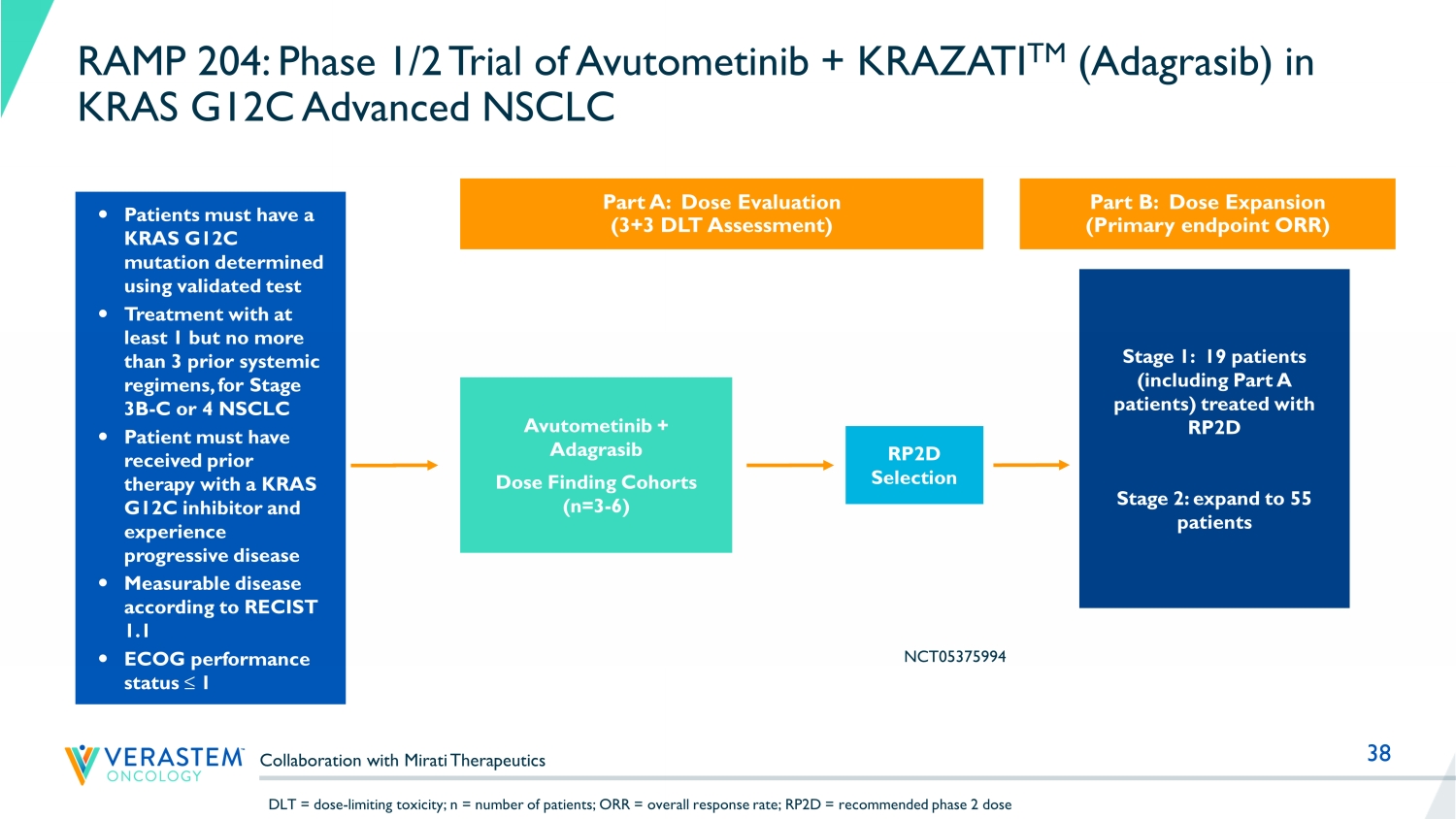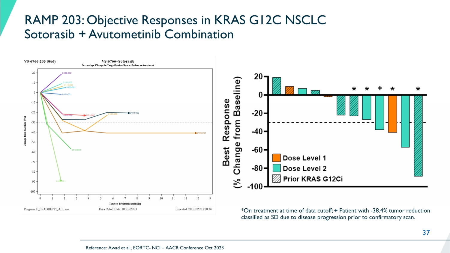 37 RAMP 203: Objective Responses in KRAS G12C NSCLC Sotorasib + Avutometinib Combination *On treatment at time of data cutoff; + Patient with - 38.4% tumor reduction classified as SD due to disease progression prior to confirmatory scan. Reference: Awad et al., EORTC - NCI – AACR Conference Oct 2023