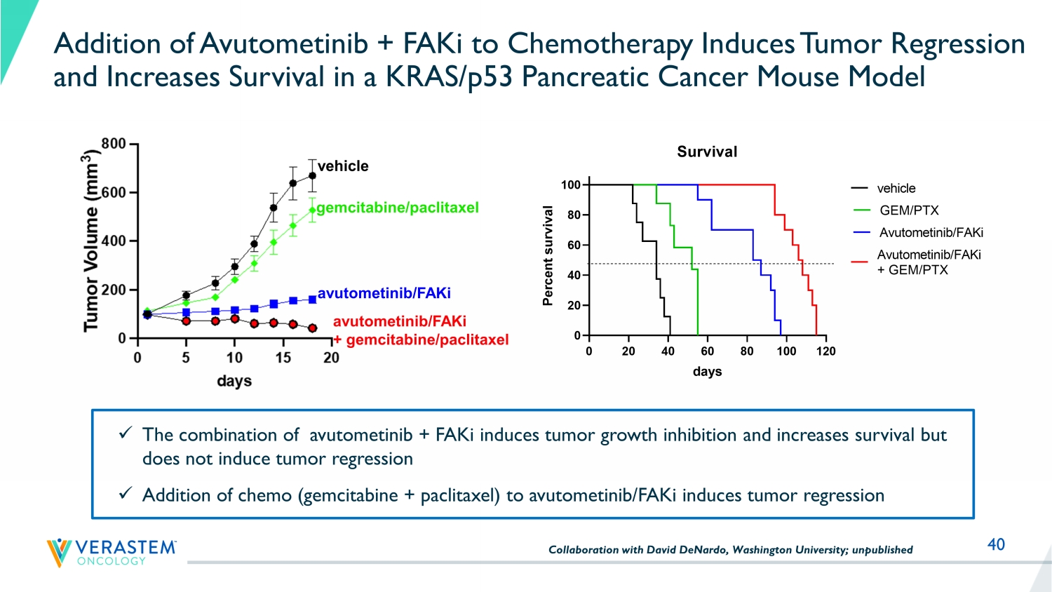40 Addition of Avutometinib + FAKi to Chemotherapy Induces Tumor Regression and Increases Survival in a KRAS/p53 Pancreatic Cancer Mouse Model x The combination of avutometinib + FAKi induces tumor growth inhibition and increases survival but does not induce tumor regression x Addition of chemo (gemcitabine + paclitaxel) to avutometinib/FAKi induces tumor regression Collaboration with David DeNardo, Washington University; unpublished vehicle avutometinib/FAKi gemcitabine/paclitaxel avutometinib/FAKi + gemcitabine/paclitaxel 0 20 40 60 80 100 120 0 20 40 60 80 100 days P e r c e n t s u r v i v a l Survival vehicle GEM/PTX Avutometinib/FAKi Avutometinib/FAKi + GEM/PTX