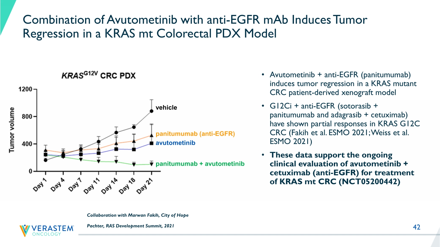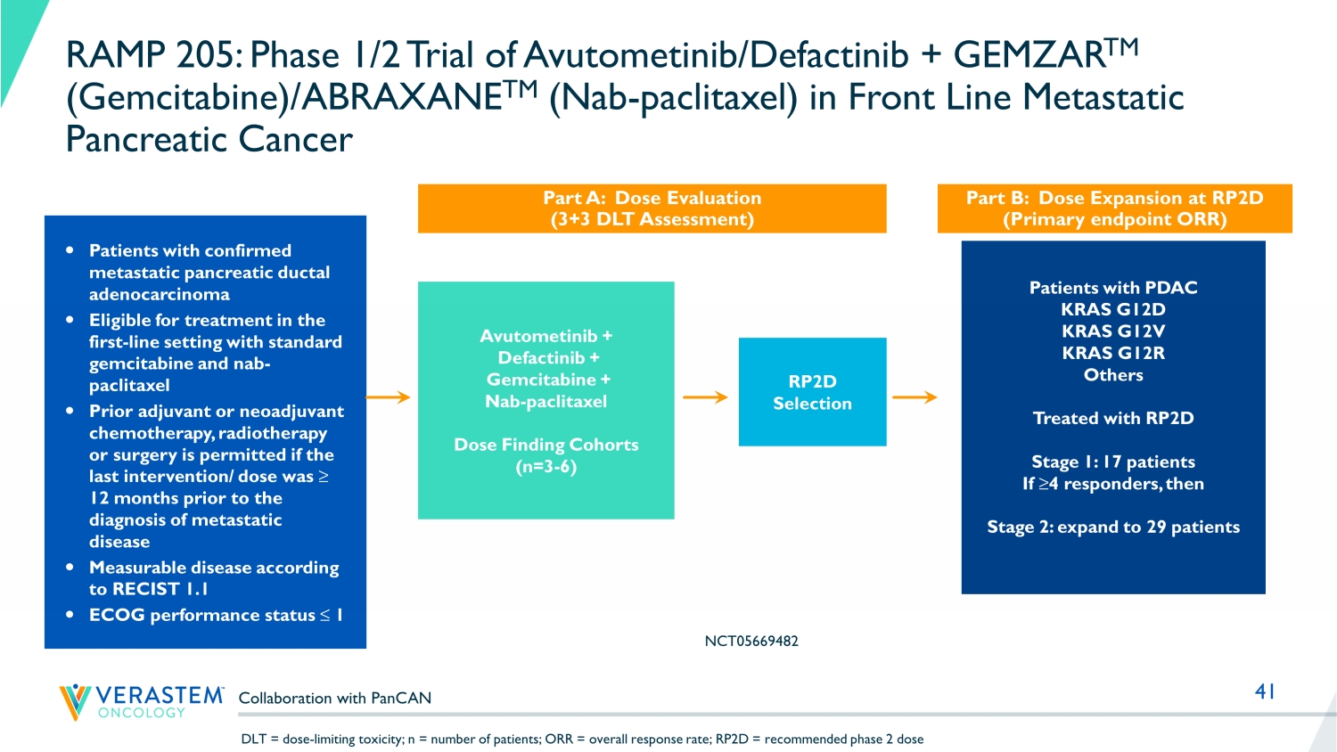 41 RAMP 205: Phase 1/2 Trial of Avutometinib/Defactinib + GEMZAR TM (Gemcitabine)/ABRAXANE TM (Nab - paclitaxel) in Front Line Metastatic Pancreatic Cancer Patients with confirmed metastatic pancreatic ductal adenocarcinoma Eligible for treatment in the first - line setting with standard gemcitabine and nab - paclitaxel Prior adjuvant or neoadjuvant chemotherapy, radiotherapy or surgery is permitted if the last intervention/ dose was ≥ 12 months prior to the diagnosis of metastatic disease Measurable disease according to RECIST 1.1 ECOG performance status ≤ 1 RP2D Selection Part A: Dose Evaluation (3+3 DLT Assessment) Part B: Dose Expansion at RP2D (Primary endpoint ORR) Patients with PDAC KRAS G12D KRAS G12V KRAS G12R Others Treated with RP2D Stage 1: 17 patients If ≥4 responders, then Stage 2: expand to 29 patients Avutometinib + Defactinib + Gemcitabine + Nab - paclitaxel Dose Finding Cohorts (n=3 - 6) Collaboration with PanCAN NCT05669482 DLT = dose - limiting toxicity; n = number of patients; ORR = overall response rate; RP2D = recommended phase 2 dose