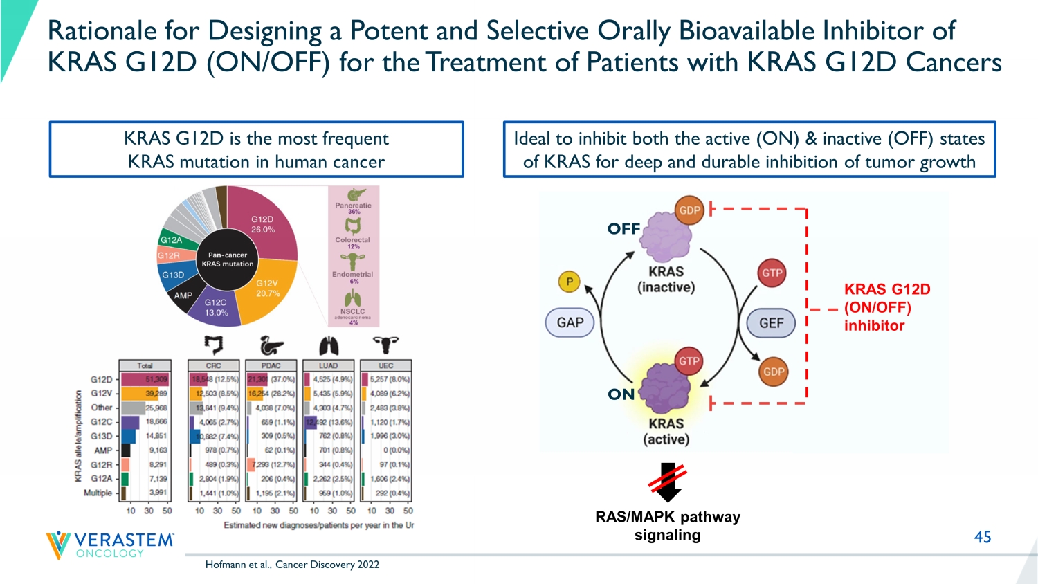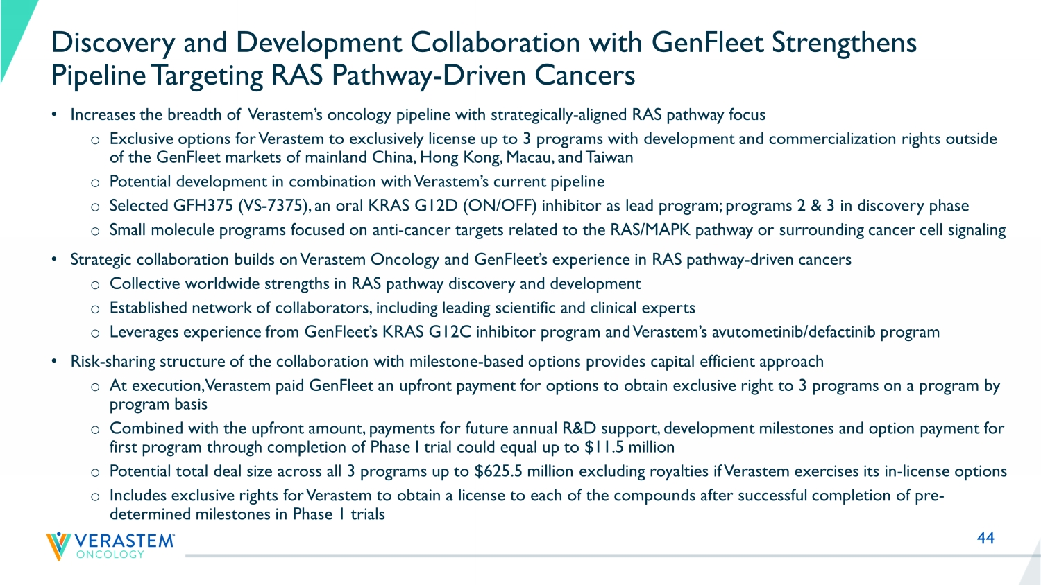 44 Discovery and Development Collaboration with GenFleet Strengthens Pipeline Targeting RAS Pathway - Driven Cancers • Increases the breadth of Verastem’s oncology pipeline with strategically - aligned RAS pathway focus o Exclusive options for Verastem to exclusively license up to 3 programs with development and commercialization rights outside of the GenFleet markets of mainland China, Hong Kong, Macau, and Taiwan o Potential development in combination with Verastem’s current pipeline o Selected GFH375 (VS - 7375), an oral KRAS G12D (ON/OFF) inhibitor as lead program; programs 2 & 3 in discovery phase o Small molecule programs focused on anti - cancer targets related to the RAS/MAPK pathway or surrounding cancer cell signaling • Strategic collaboration builds on Verastem Oncology and GenFleet’s experience in RAS pathway - driven cancers o Collective worldwide strengths in RAS pathway discovery and development o Established network of collaborators, including leading scientific and clinical experts o Leverages experience from GenFleet’s KRAS G12C inhibitor program and Verastem’s avutometinib/defactinib program • Risk - sharing structure of the collaboration with milestone - based options provides capital efficient approach o At execution, Verastem paid GenFleet an upfront payment for options to obtain exclusive right to 3 programs on a program by program basis o Combined with the upfront amount, payments for future annual R&D support, development milestones and option payment for first program through completion of Phase I trial could equal up to $11.5 million o Potential total deal size across all 3 programs up to $625.5 million excluding royalties if Verastem exercises its in - license op tions o Includes exclusive rights for Verastem to obtain a license to each of the compounds after successful completion of pre - determined milestones in Phase 1 trials