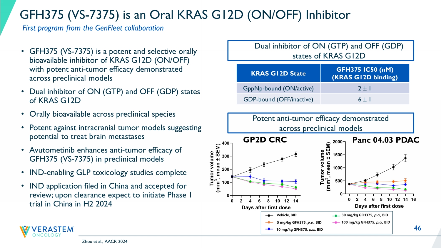 46 GFH375 (VS - 7375) is an Oral KRAS G12D (ON/OFF) Inhibitor • GFH375 (VS - 7375) is a potent and selective orally bioavailable inhibitor of KRAS G12D (ON/OFF) with potent anti - tumor efficacy demonstrated across preclinical models • Dual inhibitor of ON (GTP) and OFF (GDP) states of KRAS G12D • Orally bioavailable across preclinical species • Potent against intracranial tumor models suggesting potential to treat brain metastases • Avutometinib enhances anti - tumor efficacy of GFH375 (VS - 7375) in preclinical models • IND - enabling GLP toxicology studies complete • IND application (China) expected to be submitted in H1 2024 and initiate Phase 1 trial in H2 2024 KRAS G12D State GFH375 IC50 ( nM ) (KRAS G12D binding) GppNp - bound (ON/active) 2 1 GDP - bound (OFF/inactive) 6 1 0 2 4 6 8 10 12 14 0 100 200 300 400 Days after first dose T u m o r v o l u m e ( m m 3 , m e a n ± S E M ) GP2D CRC Panc 04.03 PDAC Zhou et al., AACR 2024 Potent anti - tumor efficacy demonstrated across preclinical models Dual inhibitor of ON (GTP) and OFF (GDP) states of KRAS G12D First program from the GenFleet collaboration