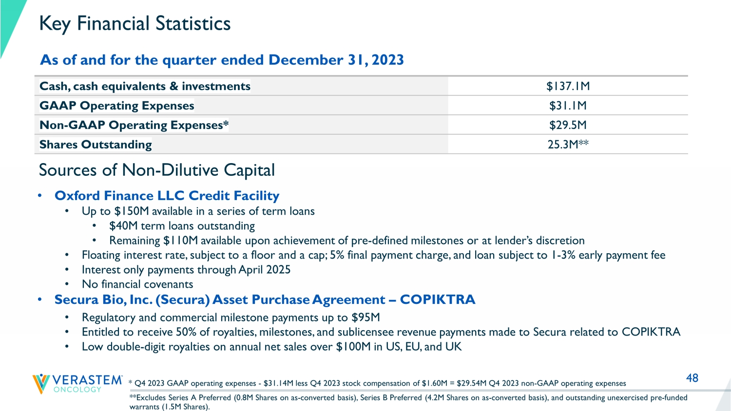 48 Key Financial Statistics Cash, cash equivalents & investments $137.1M GAAP Operating Expenses $31.1M Non - GAAP Operating Expenses* $29.5M Shares Outstanding 25.3M** As of and for the quarter ended December 31, 2023 • Oxford Finance LLC Credit Facility • Up to $150M available in a series of term loans • $40M term loans outstanding • Remaining $110M available upon achievement of pre - defined milestones or at lender’s discretion • Floating interest rate, subject to a floor and a cap; 5% final payment charge, and loan subject to 1 - 3% early payment fee • Interest only payments through April 2025 • No financial covenants • Secura Bio, Inc. (Secura) Asset Purchase Agreement – COPIKTRA • Regulatory and commercial milestone payments up to $95M • Entitled to receive 50% of royalties, milestones, and sublicensee revenue payments made to Secura related to COPIKTRA • Low double - digit royalties on annual net sales over $100M in US, EU, and UK Sources of Non - Dilutive Capital * Q4 2023 GAAP operating expenses - $31.14M less Q4 2023 stock compensation of $1.60M = $29.54M Q4 2023 non - GAAP operating expen ses **Excludes Series A Preferred (0.8M Shares on as - converted basis), Series B Preferred (4.2M Shares on as - converted basis), and o utstanding unexercised pre - funded warrants (1.5M Shares).