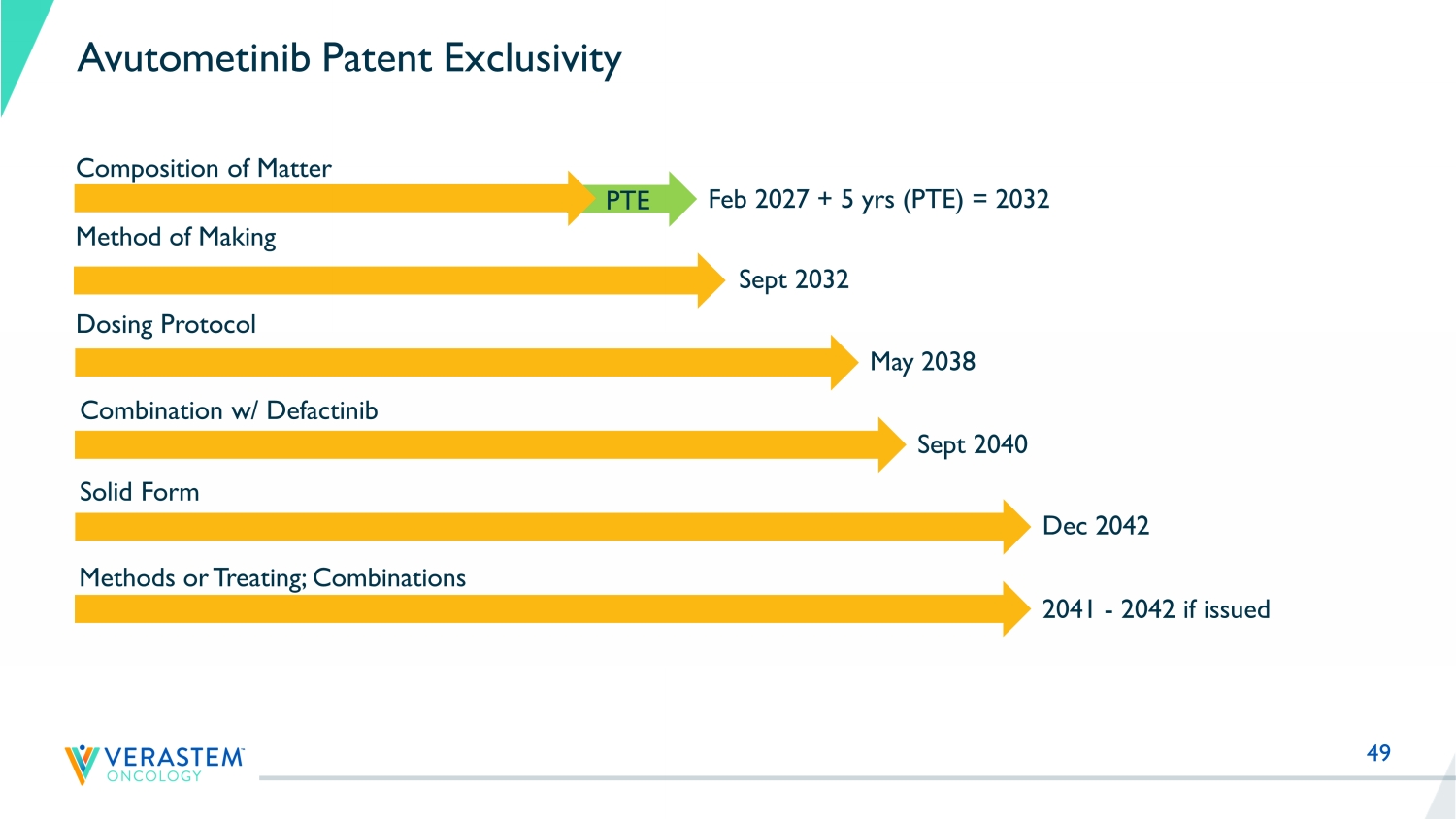 49 Avutometinib Patent Exclusivity Composition of Matter Method of Making Sept 2032 Dosing Protocol May 2038 Combination w/ Defactinib Dec 2042 Feb 2027 + 5 yrs (PTE) = 2032 Sept 2040 Solid Form PTE 2041 - 2042 if issued Methods or Treating; Combinations