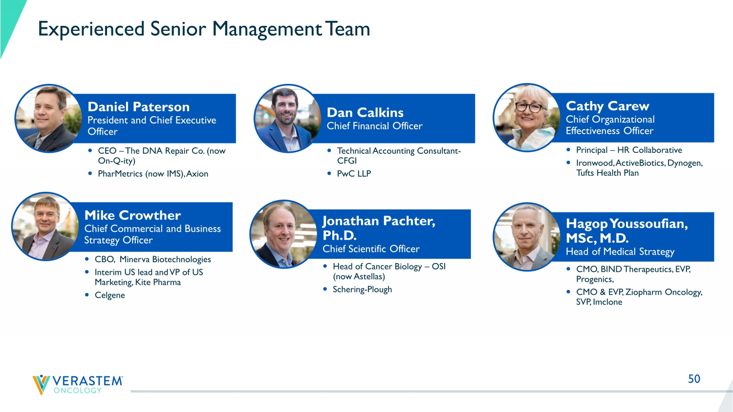 50 Experienced Senior Management Team Dan Calkins Chief Financial Officer Mike Crowther Chief Commercial and Business Strategy Officer Technical Accounting Consultant - CFGI PwC LLP CBO, Minerva Biotechnologies Interim US lead and VP of US Marketing, Kite Pharma Celgene Daniel Paterson President and Chief Executive Officer CEO – The DNA Repair Co. (now On - Q - ity) PharMetrics (now IMS), Axion Hagop Youssoufian, MSc, M.D. Head of Medical Strategy CMO, BIND Therapeutics, EVP, Progenics, CMO & EVP, Ziopharm Oncology, SVP, Imclone Cathy Carew Chief Organizational Effectiveness Officer Principal – HR Collaborative Ironwood, ActiveBiotics, Dynogen, Tufts Health Plan Jonathan Pachter, Ph.D. Chief Scientific Officer Head of Cancer Biology – OSI (now Astellas) Schering - Plough