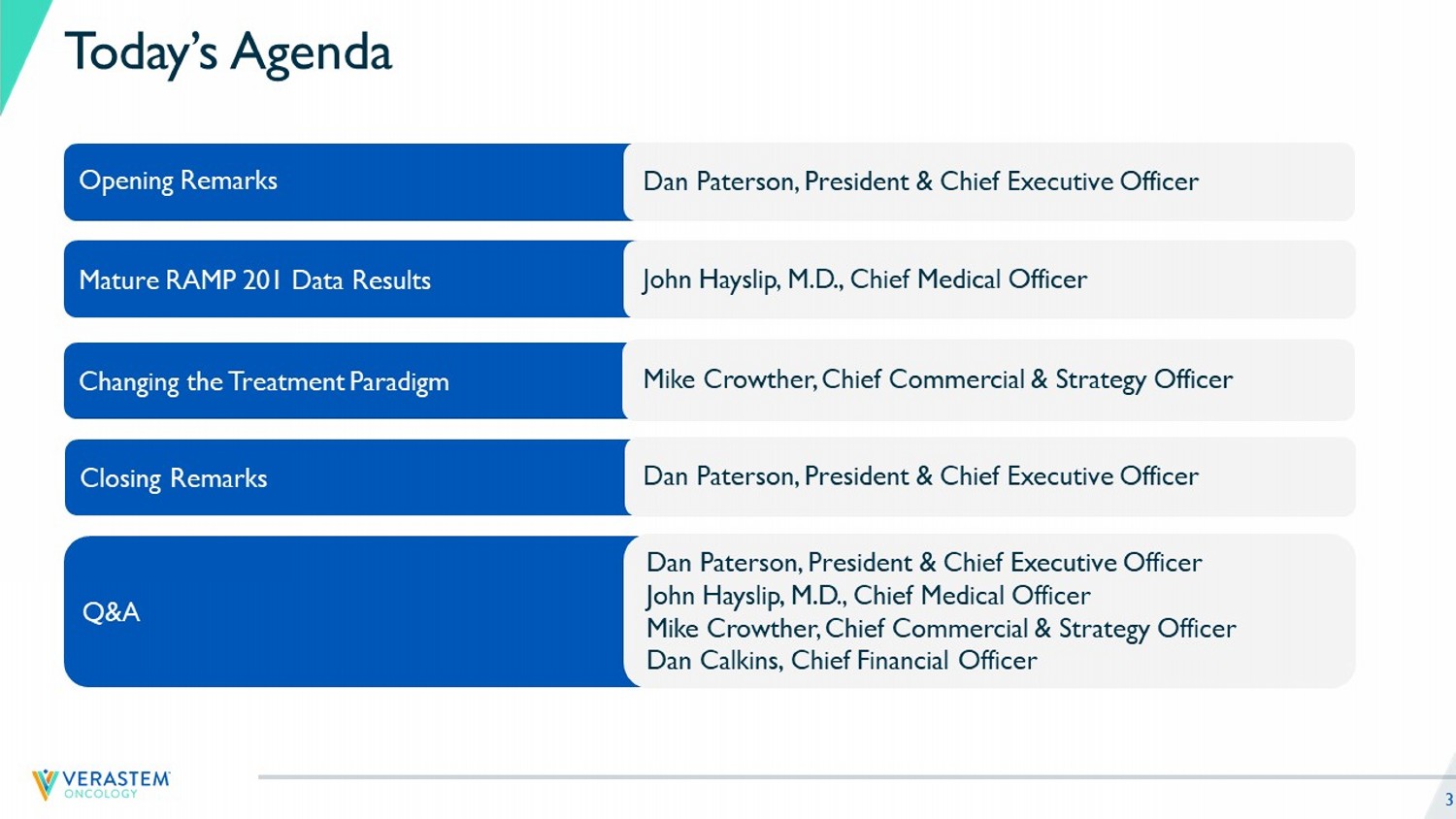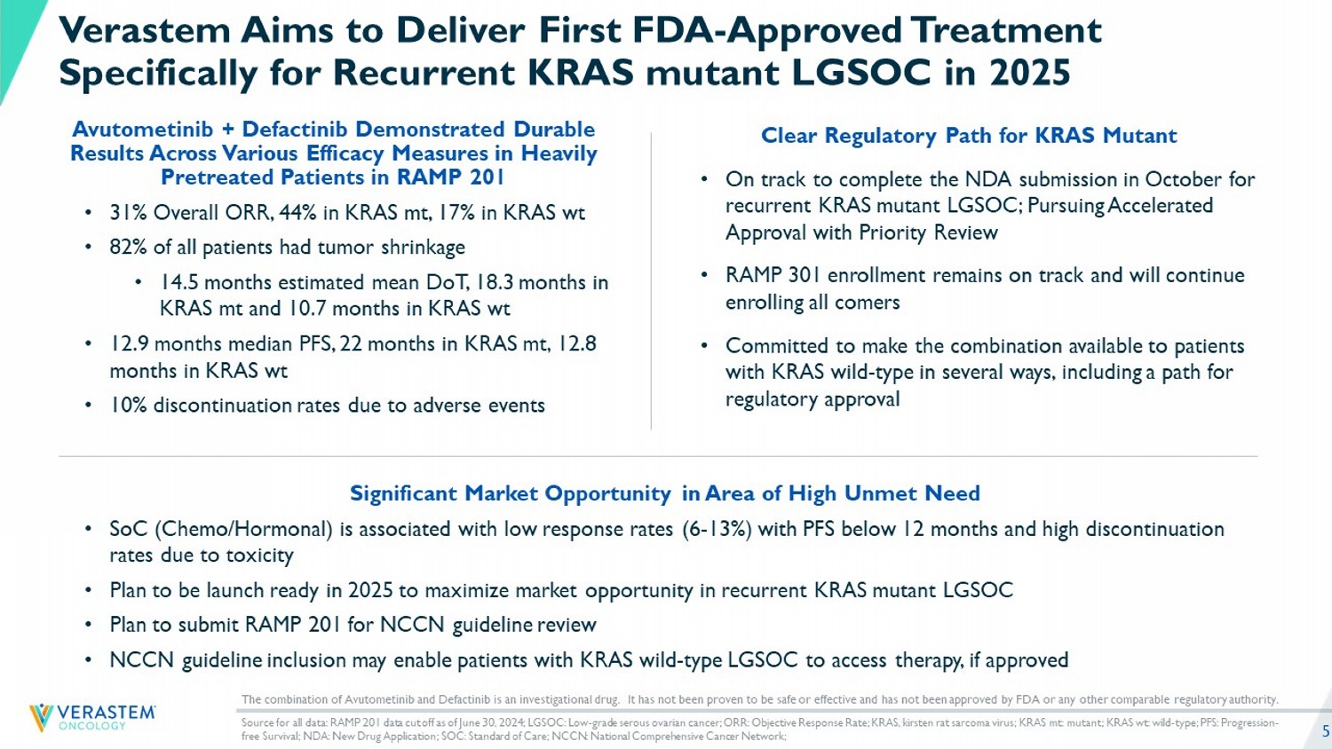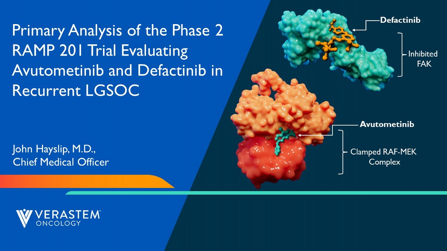 2 Forward - Looking Statements This presentation includes forward - looking statements about, among other things, Verastem Oncology’s (the “Company”) programs an d product candidates, strategy, future plans and prospects, including statements related to the scope and expecting timing for the completion of the NDA submission for the avutometinib and defactinib combination in LGSOC, the o ngo ing discussions with the FDA and the ability to obtain Accelerated Approval and Priority Review of the mature RAMP 201 data, the potential of the combination of avutometinib and defactinib to change the way patients with recurre nt LGSOC are treated, the status of enrollments for and potential of the results of the RAMP 301 Phase 3 trial to expand the indication regardless of KRAS mutation status, the structure of our planned and pending clinical trials, the potential clinical value of various of the Company's clinical trials, including the RAMP 201, RAMP 205 and RAMP 301 trials, the timing of commencing and completing trials, including topline data reports, interactions with regulators, the ti meline and indications for clinical development, regulatory submissions, the potential for and timing of commercialization of product candidates and the potential market opportunities of, and estimated addressable markets for, our dr ug candidates. The words "anticipate," "believe," "estimate," "expect," "intend," "may," "plan," "predict," "project," "target," "potential," "will," "would," "could," "should," "continue," “can,” “promising” and similar expressions are intended to identify forward - looking statements, although not all forward - looking statements contain these identifying words. Each forward - looking statement is subject to risks and uncertainties that could cause actual results to diffe r materially from those expressed or implied in such statement. Applicable risks and uncertainties include the risks and uncertainties, among other things, regarding: the success in the dev elo pment and potential commercialization of our product candidates, including avutometinib in combination with other compounds, including defactinib, LUMAKRAS and others; the uncertainties inherent in research and development, such as n ega tive or unexpected results of clinical trials, the occurrence or timing of applications for our product candidates that may be filed with regulatory authorities in any jurisdictions; whether and when regulatory authorities in any ju risdictions may approve any such applications that may be filed for our product candidates, and, if approved, whether our product candidates will be commercially successful in such jurisdictions; our ability to obtain, maintain and enf orc e patent and other intellectual property protection for our product candidates; the scope, timing, and outcome of any legal proceedings; decisions by regulatory authorities regarding trial design, labeling and other matters that could a ffe ct the timing, availability or commercial potential of our product candidates; whether preclinical testing of our product candidates and preliminary or interim data from clinical trials will be predictive of the results or success of ongoi ng or later clinical trials; that the timing, scope and rate of reimbursement for our product candidates is uncertain; that the market opportunities of our drug candidates are based on internal and third - party estimates which may prove to be incor rect; that third - party payors (including government agencies) may not reimburse; that there may be competitive developments affecting our product candidates; that data may not be available when expected; that enrollment of c lin ical trials may take longer than expected, which may delay our development programs, including delays in submission or review by the FDA of our NDA submission in recurrent KRAS mutant LGSOC if enrollment in our confirmatory trial is not well underway at the time of submission or that the FDA may require the company to enroll additional patients in the Company's ongoing RAMP 301 confirmatory Phase 3 clinical trial prior to Verastem submitting or the FD A taking action on our NDA seeking accelerated approval; risks associated with preliminary and interim data, which may not be representative of more mature data, including with respect to interim duration of therapy data; that o ur product candidates will cause adverse safety events and/or unexpected concerns may arise from additional data or analysis, or result in unmanageable safety profiles as compared to their levels of efficacy; that we may be unable to su ccessfully validate, develop and obtain regulatory approval for companion diagnostic tests for our product candidates that require or would commercially benefit from such tests, or experience significant delays in doing so; that the ma ture RAMP 201 data and associated discussions with the FDA may not support the scope of our rolling NDA submission for the avutometinib and defactinib combination in LGSOC, including with respect to KRAS wild type LGSOC; that our pr oduct candidates may experience manufacturing or supply interruptions or failures; that any of our third - party contract research organizations, contract manufacturing organizations, clinical sites, or contractors, among others, who we rely on fail to fully perform; that we face substantial competition, which may result in others developing or commercializing products before or more successfully than we do which could result in reduced market share or m ark et potential for our product candidates; that we will be unable to successfully initiate or complete the clinical development and eventual commercialization of our product candidates; that the development and commercialization of our product candidates will take longer or cost more than planned, including as a result of conducting additional studies or our decisions regarding execution of such commercialization; that we may not have sufficient cash t