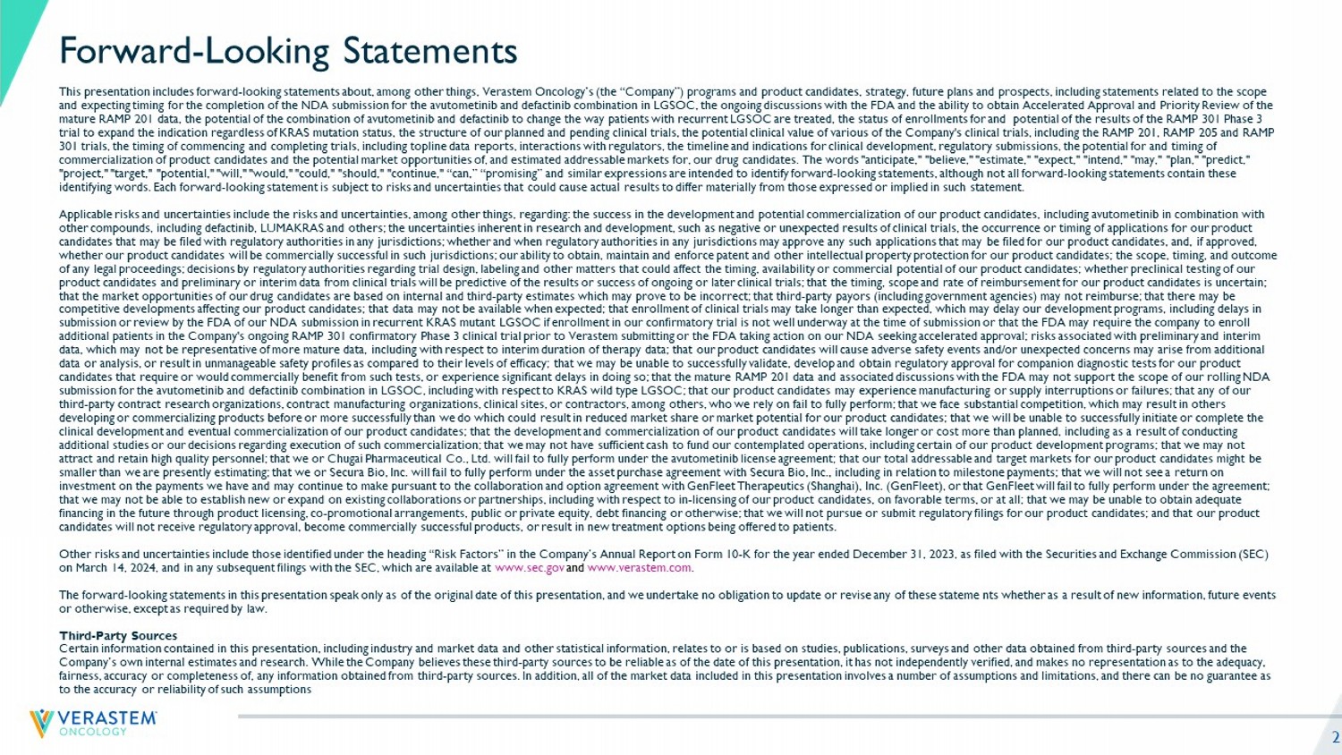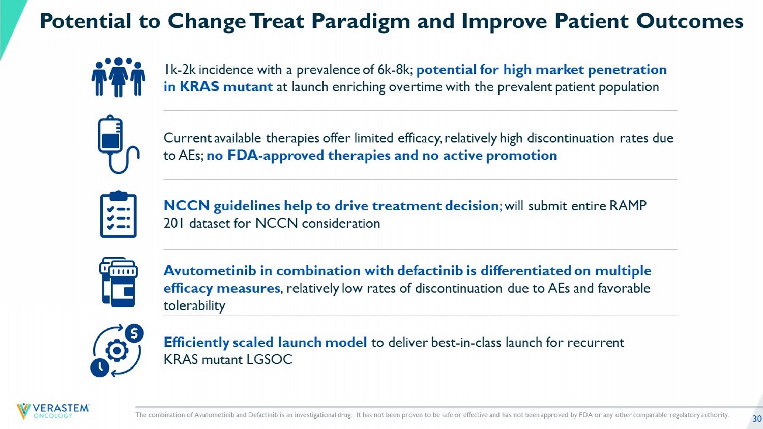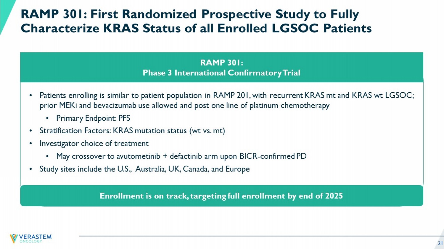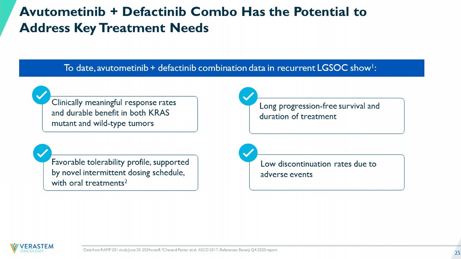 2 Forward - Looking Statements This presentation includes forward - looking statements about, among other things, Verastem Oncology’s (the “Company”) programs an d product candidates, strategy, future plans and prospects, including statements related to the scope and expecting timing for the completion of the NDA submission for the avutometinib and defactinib combination in LGSOC, the o ngo ing discussions with the FDA and the ability to obtain Accelerated Approval and Priority Review of the mature RAMP 201 data, the potential of the combination of avutometinib and defactinib to change the way patients with recurre nt LGSOC are treated, the status of enrollments for and potential of the results of the RAMP 301 Phase 3 trial to expand the indication regardless of KRAS mutation status, the structure of our planned and pending clinical trials, the potential clinical value of various of the Company's clinical trials, including the RAMP 201, RAMP 205 and RAMP 301 trials, the timing of commencing and completing trials, including topline data reports, interactions with regulators, the ti meline and indications for clinical development, regulatory submissions, the potential for and timing of commercialization of product candidates and the potential market opportunities of, and estimated addressable markets for, our dr ug candidates. The words "anticipate," "believe," "estimate," "expect," "intend," "may," "plan," "predict," "project," "target," "potential," "will," "would," "could," "should," "continue," “can,” “promising” and similar expressions are intended to identify forward - looking statements, although not all forward - looking statements contain these identifying words. Each forward - looking statement is subject to risks and uncertainties that could cause actual results to diffe r materially from those expressed or implied in such statement. Applicable risks and uncertainties include the risks and uncertainties, among other things, regarding: the success in the dev elo pment and potential commercialization of our product candidates, including avutometinib in combination with other compounds, including defactinib, LUMAKRAS and others; the uncertainties inherent in research and development, such as n ega tive or unexpected results of clinical trials, the occurrence or timing of applications for our product candidates that may be filed with regulatory authorities in any jurisdictions; whether and when regulatory authorities in any ju risdictions may approve any such applications that may be filed for our product candidates, and, if approved, whether our product candidates will be commercially successful in such jurisdictions; our ability to obtain, maintain and enf orc e patent and other intellectual property protection for our product candidates; the scope, timing, and outcome of any legal proceedings; decisions by regulatory authorities regarding trial design, labeling and other matters that could a ffe ct the timing, availability or commercial potential of our product candidates; whether preclinical testing of our product candidates and preliminary or interim data from clinical trials will be predictive of the results or success of ongoi ng or later clinical trials; that the timing, scope and rate of reimbursement for our product candidates is uncertain; that the market opportunities of our drug candidates are based on internal and third - party estimates which may prove to be incor rect; that third - party payors (including government agencies) may not reimburse; that there may be competitive developments affecting our product candidates; that data may not be available when expected; that enrollment of c lin ical trials may take longer than expected, which may delay our development programs, including delays in submission or review by the FDA of our NDA submission in recurrent KRAS mutant LGSOC if enrollment in our confirmatory trial is not well underway at the time of submission or that the FDA may require the company to enroll additional patients in the Company's ongoing RAMP 301 confirmatory Phase 3 clinical trial prior to Verastem submitting or the FD A taking action on our NDA seeking accelerated approval; risks associated with preliminary and interim data, which may not be representative of more mature data, including with respect to interim duration of therapy data; that o ur product candidates will cause adverse safety events and/or unexpected concerns may arise from additional data or analysis, or result in unmanageable safety profiles as compared to their levels of efficacy; that we may be unable to su ccessfully validate, develop and obtain regulatory approval for companion diagnostic tests for our product candidates that require or would commercially benefit from such tests, or experience significant delays in doing so; that the ma ture RAMP 201 data and associated discussions with the FDA may not support the scope of our rolling NDA submission for the avutometinib and defactinib combination in LGSOC, including with respect to KRAS wild type LGSOC; that our pr oduct candidates may experience manufacturing or supply interruptions or failures; that any of our third - party contract research organizations, contract manufacturing organizations, clinical sites, or contractors, among others, who we rely on fail to fully perform; that we face substantial competition, which may result in others developing or commercializing products before or more successfully than we do which could result in reduced market share or m ark et potential for our product candidates; that we will be unable to successfully initiate or complete the clinical development and eventual commercialization of our product candidates; that the development and commercialization of our product candidates will take longer or cost more than planned, including as a result of conducting additional studies or our decisions regarding execution of such commercialization; that we may not have sufficient cash t