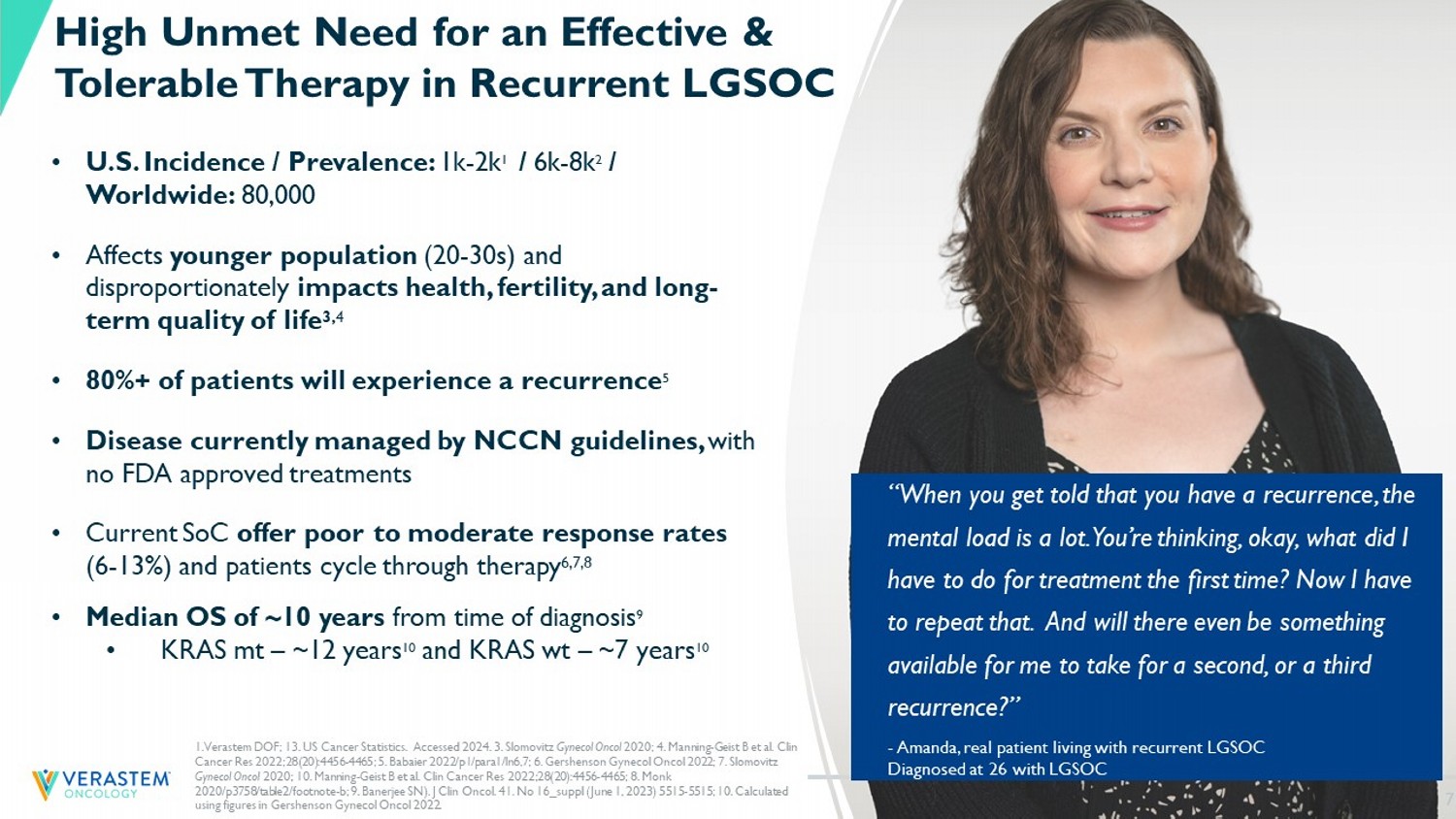 23 Disproportionally affects younger women 1 Pre - Diagnosis Nonspecific signs and symptoms 2 Ultrasound and bloodwork 3 Average delay up to 3 years 4 Diagnosis Poor r esponse rates of current treatments w ith high discontinuation rates 5,6 Treatment Symptom Progression & Testing Treatment A fter Recurrence Pathology report confirmation of disease 3 Surgery 3 of patients will receive ChemoTx 7 frontline 95% Recurrent treatments include chemotherapy, hormonal therapy, MEK inhibitors or clinical trial 3 Up to 60% of patients will be retreated with chemotherapy at initial recurrence 7 After subsequent recurrence, doctors typically choose chemo or clinical trials over MEK - only inhibitors 7 47% will be rechallenged with chemotherapy at subsequent recurrence 7 80% of Patients with LGSOC Recur and Often Cycle Through Treatments &UHDWHGE\5DQDK3L[HO6WXGLR IURPWKH1RXQ3URMHFW 80% of patients will recur 8 Driven by NCCN Guidelines 1. B. Slomovitz , C. Gourley, M.S. Carey, et al., Low - grade serous ovarian cancer: State of the science, Gynecologic Oncology, https://doi.org/1 0.1016/j.ygyno.2019.12.033; 2. Harvard Health 2017. https://www.health.harvard.edu/cancer/certain - symptoms - may - be - early - signs - of - ovarian - cancer. Assessed October 8, 2024; 3. NCCN Clinical Practice Guidelines in Oncology: (NCCN Guidelines®) for Ovarian Cancer Including Fallopian Tube Cancer and Primary Peritoneal Cancer V. 3.2024; 4. LGSOC Patient Impact Survey Research Findings, Harris Poll 2023. https://www.businesswire.com/news/home/2023110792 672 6/en/ ; 5. Monk BJ et al. J Clin Oncol 2020 (MILO); 6. Gershenson DM et al. Lancet 2022 (GOG 281); 7. Verastem DOF. Demand Study March 2024. \ ; 8. Gershenson et al J Clin Oncol 2015.