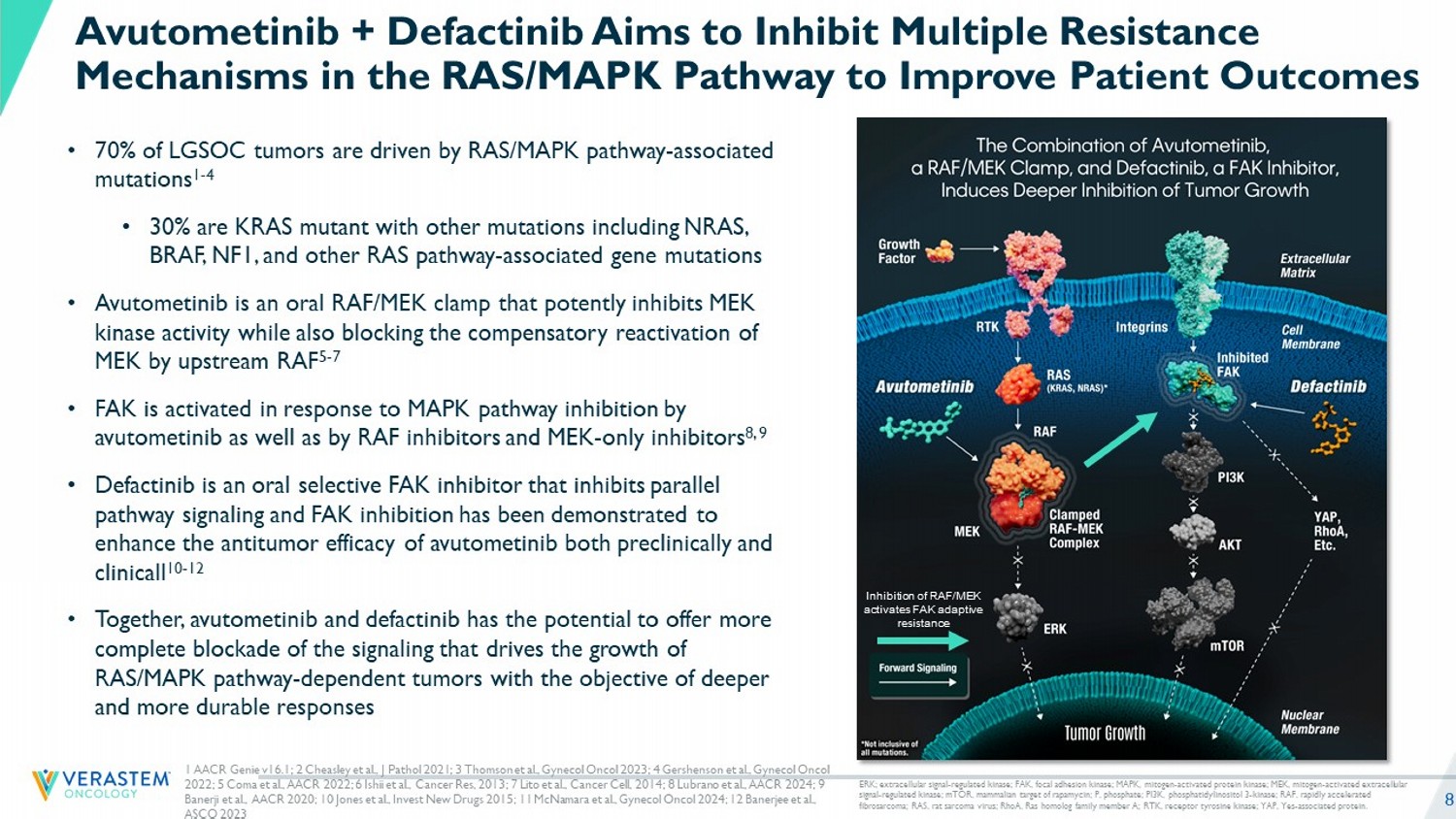 7 High Unmet Need for an Effective & Tolerable Therapy in Recurrent LGSOC “When you get told that you have a recurrence, the mental load is a lot. You’re thinking, okay, what did I have to do for treatment the first time? Now I have to repeat that. And will there even be something available for me to take for a second, or a third recurrence?” - Amanda, real patient living with recurrent LGSOC Diagnosed at 26 with LGSOC • U.S. Incidence / Prevalence: 1k - 2k 1 / 6k - 8k 2 / W orldwide : 80,000 • Affects younger population (20 - 30s) and disproportionately impacts health, fertility, and long - term quality of life 3, 4 • 80%+ of patients will experience a recurrence 5 • Disease currently managed by NCCN guidelines, with no FDA approved treatments • Current S o C offer poor to moderate response rates (6 - 13%) and patients cycle through therapy 6,7,8 • Median OS of ~10 years from time of diagnosis 9 • KRAS mt – ~12 years 10 and KRAS wt – ~7 years 10 1. Verastem DOF; 13. US Cancer Statistics. Accessed 2024. 3. Slomovitz Gynecol Oncol 2020; 4. Manning - Geist B et al. Clin Cancer Res 2022;28(20):4456 - 4465; 5. Babaier 2022/p1/para1/ln6,7; 6. Gershenson Gynecol Oncol 2022; 7. Slomovitz Gynecol Oncol 2020; 10. Manning - Geist B et al. Clin Cancer Res 2022;28(20):4456 - 4465; 8. Monk 2020/p3758/table2/footnote - b; 9. Banerjee SN). J Clin Oncol. 41. No 16_suppl (June 1, 2023) 5515 - 5515; 10. Calculated using figures in Gershenson Gynecol Oncol 2022.