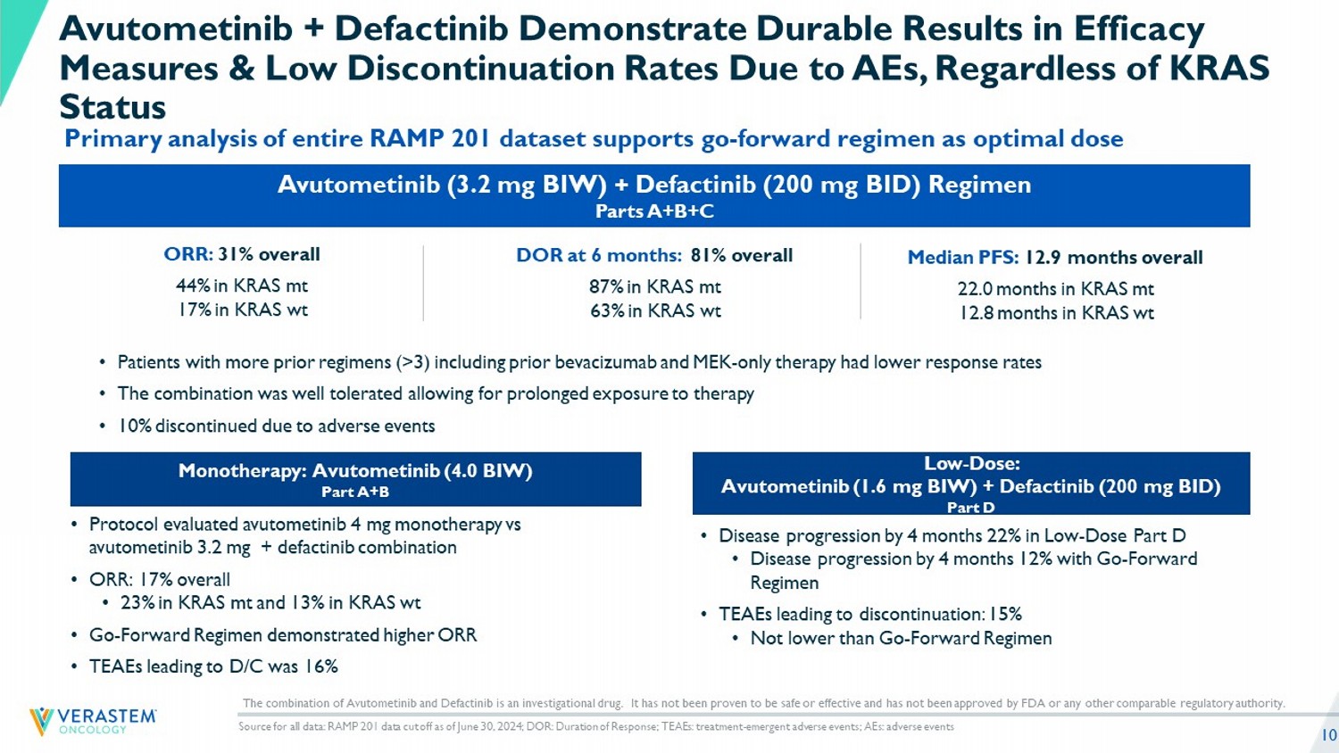 9 Key Inclusion Criteria • Recurrent LGSOC • Prior chemotherapy • Measurable disease (RECIST 1.1) • Prior MEKi allowed Avutometinib + Defactinib 3.2 mg BIW 200 mg BID KRAS mt (n=20) KRAS wt (n=22) Avutometinib + Defactinib 3.2 mg BIW 200 mg BID KRAS mt (n=22) KRAS wt (n=20) Avutometinib + Defactinib 1.6 mg BIW 200 mg BID KRAS mt (n=11) KRAS wt (n=16) Avutometinib + Defactinib 3.2 mg BIW 200 mg BID KRAS mt (n=16) KRAS wt (n=15) Go Forward Regimen Selection Criteria (Selection Phase): • Observed ORR is comparatively greater than the other regimen • Observed ORR of the leading regimen is ≥15% Primary Endpoint: ORR (BICR) Evaluation of ORR in Combination Arm: • In KRAS mt patients • All patients (KRAS mt & wt ) Actual Enrollment at RP2D: 115 Treated Patients Avutometinib Mono 4.0 mg BIW KRAS mt (n=15) KRAS wt (n=22) Avutometinib Mono 4.0 mg BIW KRAS mt (n=16) KRAS wt (n=16) Part A Selection Phase Part B Expansion Phase Part C Expansion Phase Combo Part D Low - dose Avuto Combo x x x x Go Forward Regimen Numbers represent patients treated on study. RECIST: Response Evaluation Criteria in Solid Tumors; MEKi : Mitogen - activated extracellular signal - regulated kinase inhibitor; BICR, blinded independent central review; BID, twice daily; BIW, twice weekly; RP2D: Recommended Phase 2 Dose RAMP 201: Registration - Directed Phase 2 Trial of Avutometinib ± Defactinib in Patients with Recurrent LGSOC RAMP 201 (ENGOT - ov60/GOG - 3052)