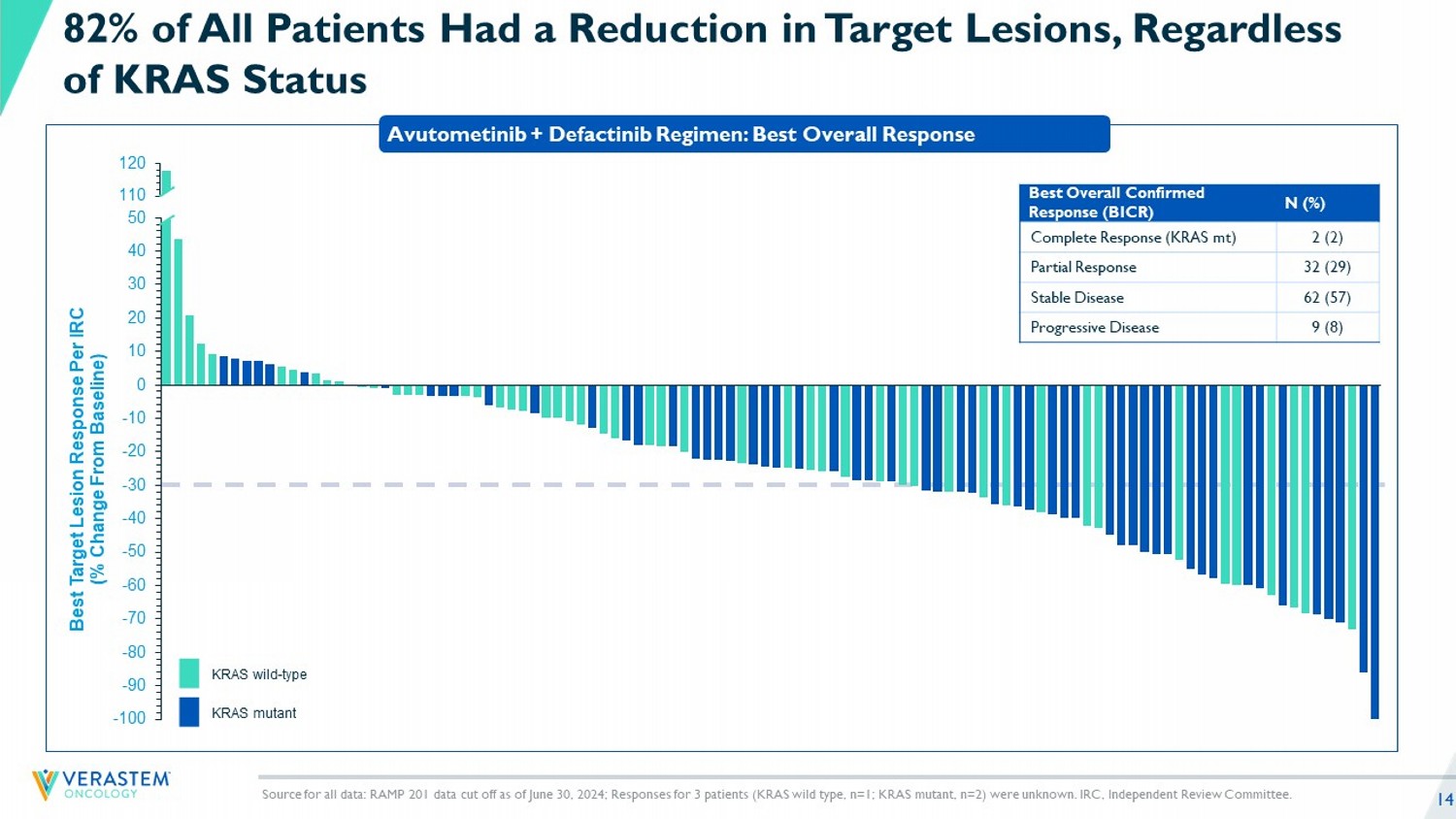 13 Median time to response (range, 1.7 - 19.2) 3.7 MONTHS DOR for KRAS mt and 63% for KRAS wt at 6 months 87% Avutometinib + Defactinib 3.2 mg BIW + 200 mg BID 3 weeks on / 1 week off KRAS wt N=9 KRAS mt N=25 All Patients N=34 9.2 (5.5, NE) 31.1 (14.8, 31.1) 31.1 (14.8, 31.1) DOR ( mo ), median (range) 63% (23%, 86%) 87% (66%, 96%) 81% (62%, 91%) DOR >= 6 mo * (95% CI) NE 82% (65%, 98%) 72% (54%, 89%) DOR >= 12 mo * (95% CI) 81% of Patients Achieved a Duration of Response of at Least 6 Months Avutometinib + Defactinib Regimen: Duration of Response Source for all data: RAMP 201 data cut off as of June 30, 2024 *KM estimates; NE = Could not be estimated based on number of patients with loss of response.