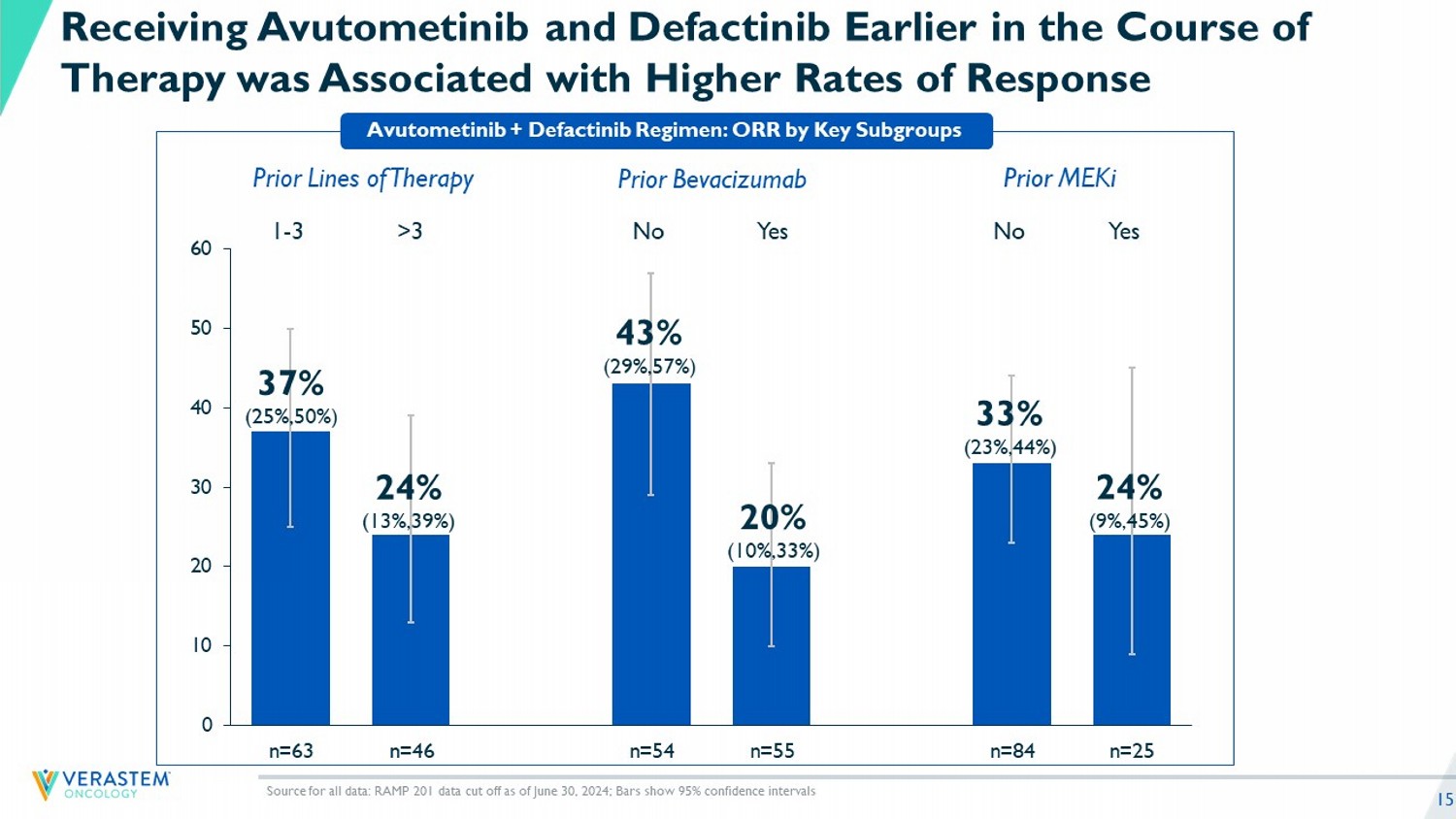14 -100 -90 -80 -70 -60 -50 -40 -30 -20 -10 0 10 20 30 40 50 Best Target Lesion Response Per IRC (% Change From Baseline) 110 120 Best Target Lesion Response Per IRC (% Change From Baseline) Avutometinib + Defactinib Regimen: Best Overall Response 82% of All Patients Had a Reduction in Target Lesions, Regardless of KRAS Status Source for all data: RAMP 201 data cut off as of June 30, 2024; Responses for 3 patients (KRAS wild type, n=1; KRAS mutant, n =2) were unknown. IRC, Independent Review Committee. N (%) Best Overall Confirmed Response (BICR) 2 (2) Complete Response (KRAS mt) 32 (29) Partial Response 62 (57) Stable Disease 9 (8) Progressive Disease KRAS wild - type KRAS mutant