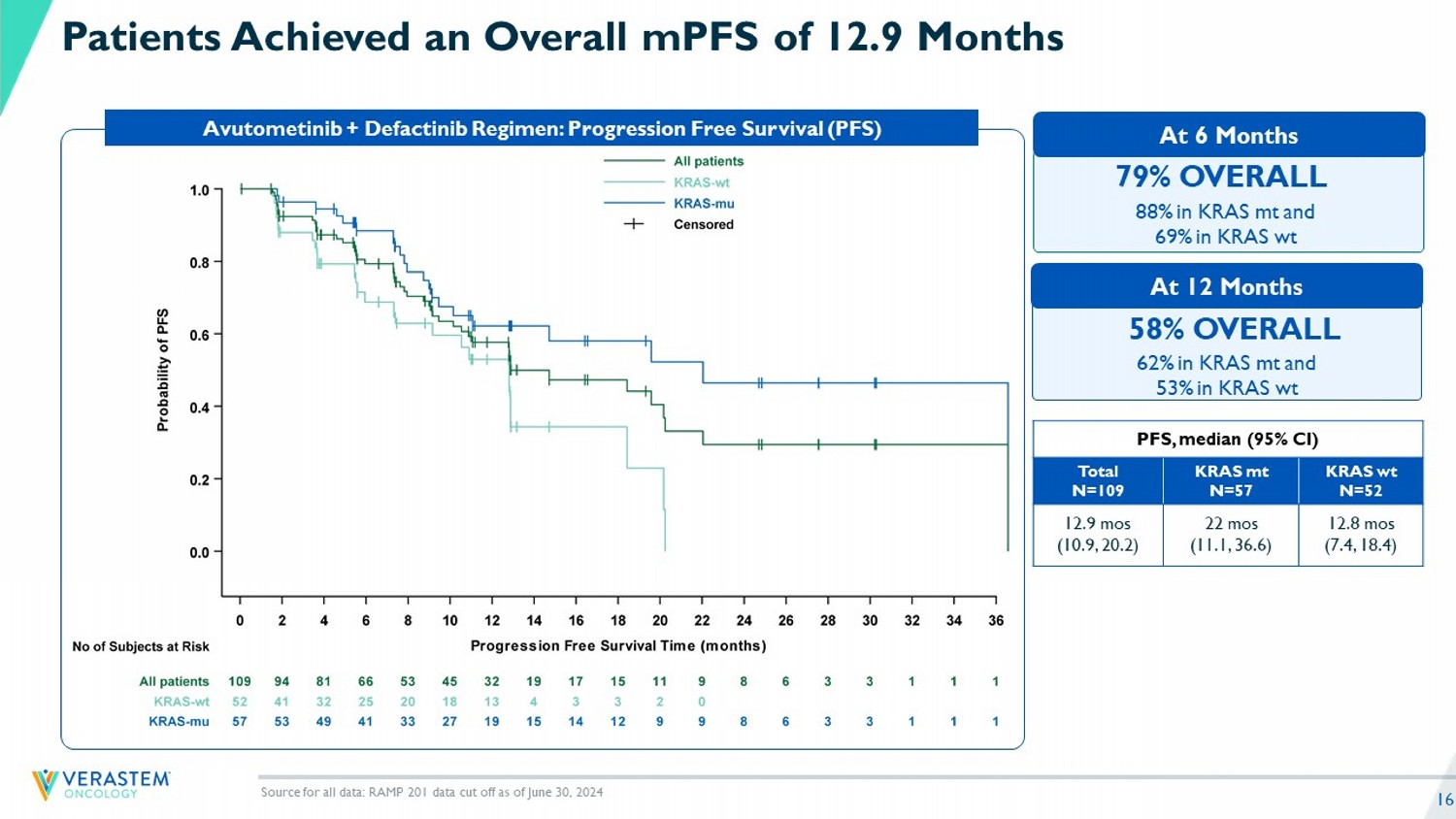 5 Avutometinib + Defactinib Demonstrated Durable Results Across Various Efficacy Measures in Heavily Pretreated Patients in RAMP 201 • 31% Overall ORR, 44% in KRAS mt, 17% in KRAS wt • 82% of all patients had tumor shrinkage • 14.5 months estimated mean DoT, 18.3 months in KRAS mt and 10.7 months in KRAS wt • 12.9 months median PFS, 22 months in KRAS mt, 12.8 months in KRAS wt • 10% discontinuation rates due to adverse events Clear Regulatory Path for KRAS Mutant • On track to complete the NDA submission in October for recurrent KRAS mutant LGSOC; Pursuing Accelerated Approval with Priority Review • RAMP 301 enrollment remains on track and will continue enrolling all comers • Committed to make the combination available to patients with KRAS wild - type in several ways, including a path for regulatory approval Verastem Aims to Deliver First FDA - Approved Treatment Specifically for Recurrent KRAS mutant LGSOC in 2025 Significant Market Opportunity in Area of High Unmet Need • SoC (Chemo/Hormonal) is associated with low response rates (6 - 13%) with PFS below 12 months and high discontinuation rates due to toxicity • Plan to be launch ready in 2025 to maximize market opportunity in recurrent KRAS mutant LGSOC • Plan to submit RAMP 201 for NCCN guideline review • NCCN guideline inclusion may enable patients with KRAS wild - type LGSOC to access therapy, if approved Source for all data: RAMP 201 data cut off as of June 30, 2024; LGSOC: Low - grade serous ovarian cancer; ORR: Objective Response Rate; KRAS, kirsten rat sarcoma virus; KRAS mt: mutant; KRAS wt : wild - type; PFS: Progression - free Survival; NDA: New Drug Application; SOC: Standard of Care; NCCN: National Comprehensive Cancer Network; The combination of Avutometinib and Defactinib is an investigational drug. It has not been proven to be safe or effective and h as not been approved by FDA or any other comparable regulatory authority.
