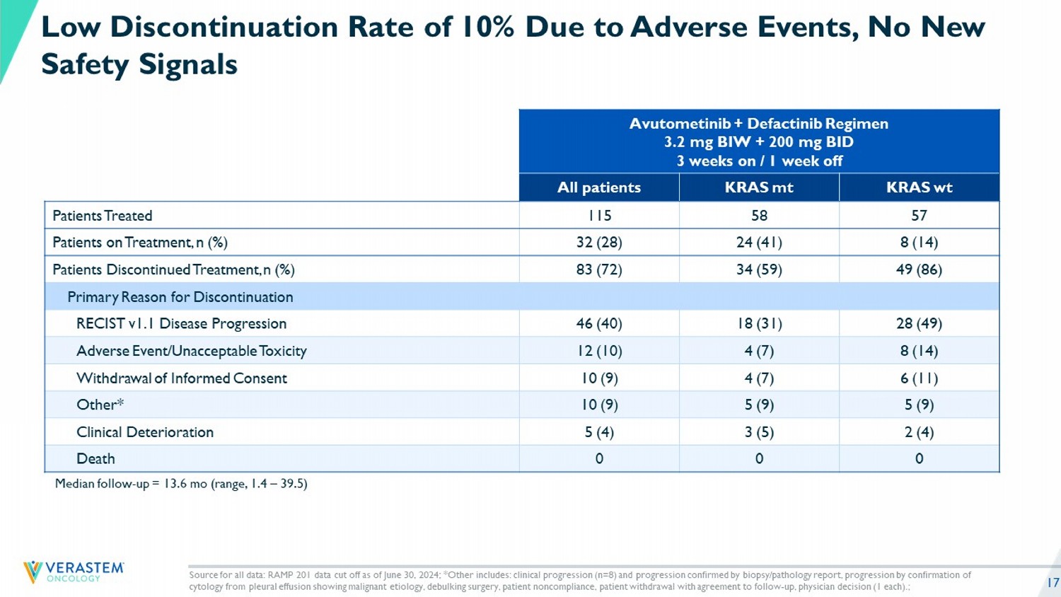 16 88% in KRAS mt and 69% in KRAS wt 79% OVERALL 62% in KRAS mt and 53% in KRAS wt 58% OVERALL Patients Achieved an Overall mPFS of 12.9 Months Avutometinib + Defactinib Regimen: Progression Free Survival (PFS) PFS, median (95% CI) KRAS wt N=52 KRAS mt N=57 Total N=109 12.8 mos (7.4, 18.4) 22 mos (11.1, 36.6) 12.9 mos (10.9, 20.2) Source for all data: RAMP 201 data cut off as of June 30, 2024 At 12 Months At 6 Months