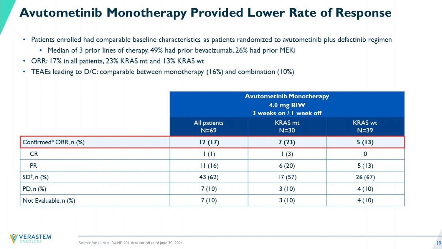 18 Avutometinib Plus Defactinib C ontinue to Demonstrate a W ell - Tolerated Safety Pr ofile Severe adverse events are generally uncommon and typically managed by a treatment pause 10% (12/115) discontinued for AEs (any cause); most common increased CPK (n=4) 80% (92/115) had AEs leading to dose interruption • 38% (44/115) for elevations in CPK 36.5% (42/115) had AEs leading to dose reduction • Mean relative dose intensity of 0.84 for avutometinib and 0.77 for defactinib 7% (8/115) of patients had serious AEs considered by the investigator to be related to study treatment: the only event occurring in more than 1 patient was abdominal pain 4 deaths (within 30 days of discontinuation) but were not considered related to the study treatment: • GI hemorrhage, large intestine perforation, clinical progression, clinical deterioration Avutometinib + Defactinib Regimen 3.2 mg BIW + 200 mg BID 3 weeks on/1 week off N= 115 Treatment - Related Adverse Events (>20% of patients)* n (%) Grade ≥3 All Grades Preferred term Non - laboratory AEs 3 (2.6) 77 (67.0) Nausea 9 (7.8) 67 (58.3) Diarrhea 1 (0.9) 61 (53.0) Oedema peripheral 3 (2.6) 50 (43.5) Fatigue 3 (2.6) 49 (42.6) Vomiting 0 47 (40.9) Vision blurred 2 (1.7) 41 (35.7) Rash 5 (4.3) 39 (33.9) Dermatitis acneiform 0 30 (26.1) Dry skin 6 (5.2) 26 (22.6) Anemia Laboratory - related AEs 28 (24.3) 69 (60.0) Increased blood CPK 5 (4.3) 38 (33.0) Increased blood bilirubin increased/ hyperbilirubinemia 2 (1.7) 36 (31.3) AST increased Source for all data: RAMP 201 data cut off as of June 30, 2024; *Most common adverse events (preferred term) considered by th e i nvestigator to be related to study drug (either avutometinib or defactinib); AE, adverse event; AST; aspartate aminotransferase; CPK, creatine phosphokinase; GI, gastrointestinal.