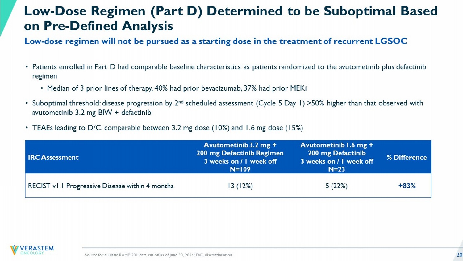 19 Avutometinib Monotherapy Provided Lower Rate of Response • Patients enrolled had comparable baseline characteristics as patients randomized to avutometinib plus defactinib regimen • Median of 3 prior lines of therapy, 49% had prior bevacizumab, 26% had prior MEKi • ORR: 17% in all patients, 23% KRAS mt and 13% KRAS wt • TEAEs leading to D/C: comparable between monotherapy (16%) and combination (10%) Source for all data: RAMP 201 data cut off as of June 30, 2024 Avutometinib Monotherapy 4.0 mg BIW 3 weeks on / 1 week off KRAS wt N=39 KRAS mt N=30 All patients N=69 5 (13) 7 (23) 12 (17) Confirmed* ORR, n (%) 0 1 (3) 1 (1) CR 5 (13) 6 (20) 11 (16) PR 26 (67) 17 (57) 43 (62) SD † , n (%) 4 (10) 3 (10) 7 (10) PD, n (%) 4 (10) 3 (10) 7 (10) Not Evaluable, n (%)