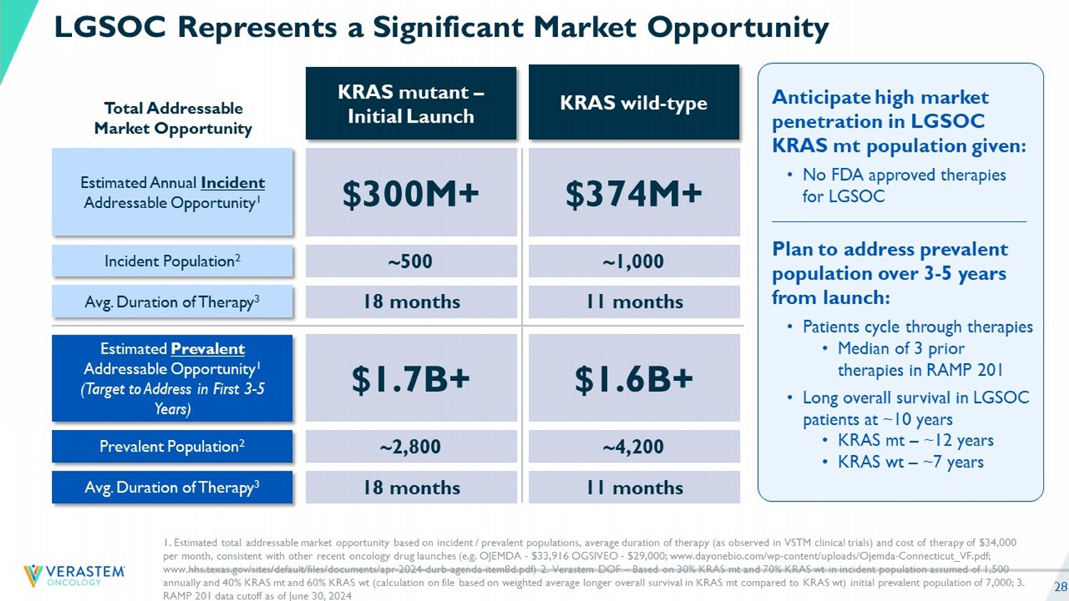 26 LGSOC Represents a Significant Market Opportunity 1. Estimated total addressable market opportunity based on incident / prevalent populations, average duration of therapy (as obs erved in VSTM clinical trials) and cost of therapy of $34,000 per month, consistent with other recent oncology drug launches (e.g. OJEMDA - $33,916 OGSIVEO - $29,000; www.dayonebio.com/wp - co ntent/uploads/Ojemda - Connecticut_VF.pdf; www.hhs.texas.gov/sites/default/files/documents/apr - 2024 - durb - agenda - item8d.pdf) 2. Verastem DOF – Based on 30% KRAS mt and 70% KRAS wt in incident population assumed of 1,500 annually and 40% KRAS mt and 60% KRAS wt (calculation on file based on weighted average longer overall survival in KRAS mt compared to KRAS wt ) initial prevalent population of 7,000; 3. RAMP 201 data cutoff as of June 30, 2 024 KRAS mutant – Initial Launch KRAS wild - type Estimated Prevalent Addressable Opportunity 1 (Target to Address in First 3 - 5 Years) Prevalent Population 2 Avg. Duration of Therapy 3 Estimated Annual Incident Addressable Opportunity 1 Incident Population 2 Avg. Duration of Therapy 3 $1.7B+ $1.6B+ ~2,800 ~4,200 18 months 11 months $300M+ $374M+ ~500 ~1,000 18 months 11 months Total Addressable Market Opportunity Anticipate high market penetration in LGSOC KRAS mt population given: • No FDA approved therapies for LGSOC Plan to address prevalent population over 3 - 5 years from launch: • Patients cycle through therapies • Median of 3 prior therapies in RAMP 201 • Long overall survival in LGSOC patients at ~10 years • KRAS mt – ~12 years • KRAS wt – ~7 years