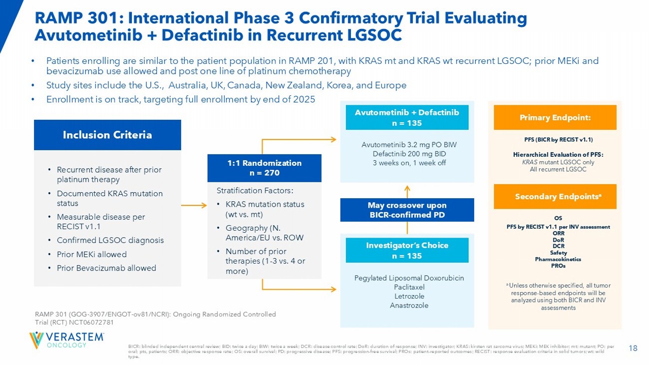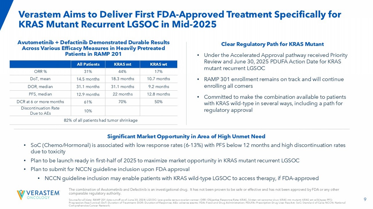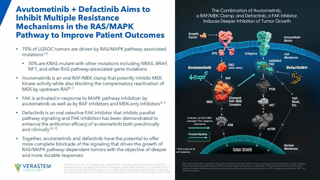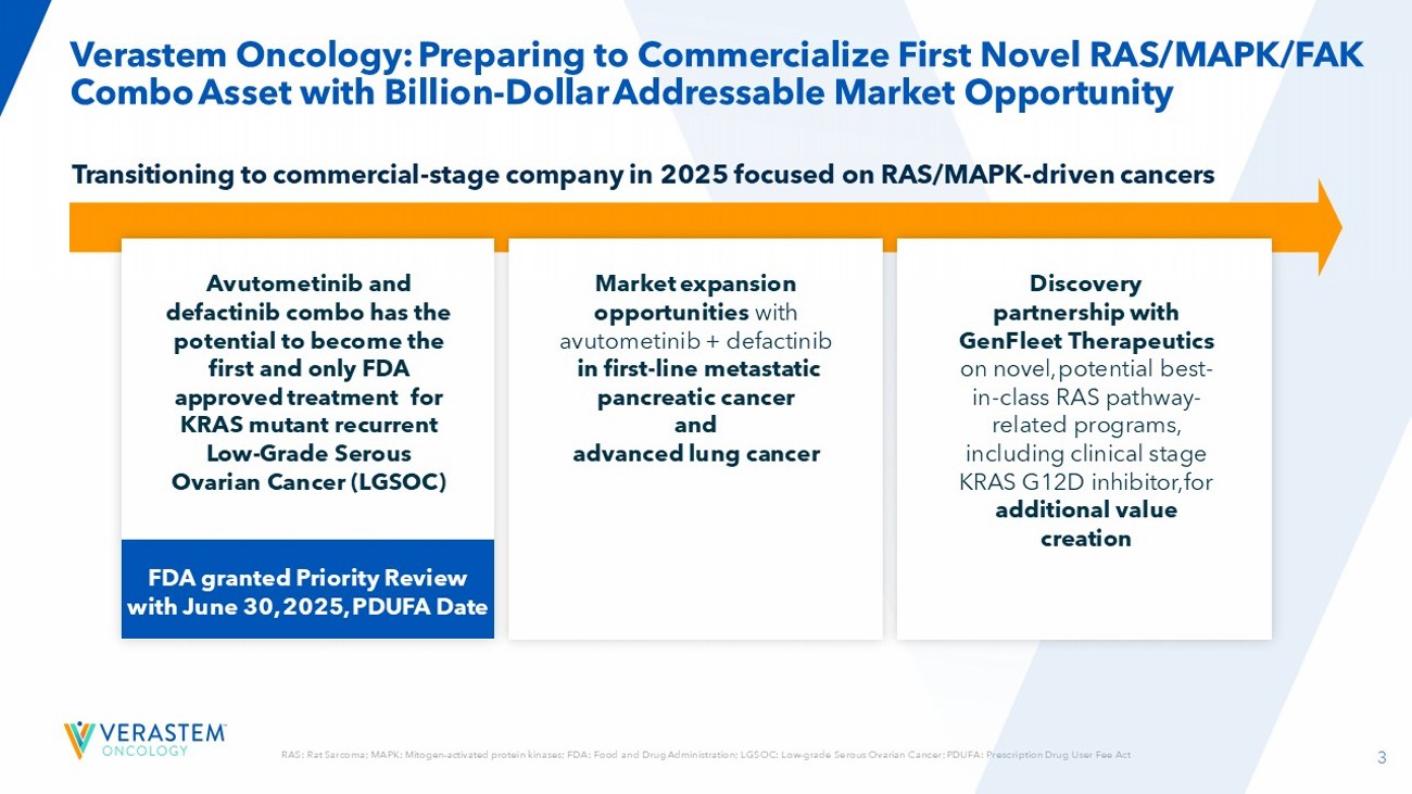 2 Forward - Looking Statements This presentation includes forward - looking statements about, among other things, Verastem Oncology’s (the “Company”) programs and product candidates, strategy, future plans and prospects, including statements relate d to the anticipated timing of a potential launch of avutometinib and defactinib in Low - Grade Serous Ovarian Cancer, the expected outcome and benefits of collaborations, including with GenFleet Therapeutics ( Shanghai), Inc. (GenFleet), including the timing of the IND for VS - 7375 and the initiation of a Phase 1/2a study with respect to the same, the status of enrollments for and potential of the results of the RAM P 301 Phase 3 trial to expand the indication regardless of KRAS mutation status, the structure of our planned and pending cli nic al trials, the potential clinical value of various of the Company's clinical trials, including the RAMP 201, RAMP 205 and RAMP 301 trial s, the timing of commencing and completing trials, including topline data reports, interactions with regulators, the timeline an d indications for clinical development, regulatory submissions, the potential for and timing of commercialization of product ca ndi dates and potential for additional development programs involving the Company’s lead compound and the potential market opportunities of, and estimated addressable markets for, our drug candidates. The words "anticipate," "believe," "estimate," "ex pect," "may," "plan," "target," "potential," "will," "would," "could," "should," "continue," “can” and similar expressions ar e i ntended to identify forward - looking statements, although not all forward - looking statements contain these identifying words. Each forward - l ooking statement is subject to risks and uncertainties that could cause actual results to differ materially from those expres sed or implied in such statement. Applicable risks and uncertainties include the risks and uncertainties, among other things, regarding: the success in the dev elo pment and potential commercialization of our product candidates, including avutometinib in combination with other compounds, including defactinib , LUMAKRAS and others; the uncertainties inherent in research and development, such as negative or unexpected results of clin ica l trials, the occurrence or timing of applications for our product candidates that may be filed with regulatory authorities in any jurisdictions; whether and when regulatory authorities in any jurisdictions may approve any such applicati ons that may be filed for our product candidates, and, if approved, whether our product candidates will be commercially successfu l in such jurisdictions; our ability to obtain, maintain and enforce patent and other intellectual property protection for our pro duc t candidates; the scope, timing, and outcome of any legal proceedings; decisions by regulatory authorities regarding trial de sig n, labeling and other matters that could affect the timing, availability or commercial potential of our product candidates; whet her preclinical testing of our product candidates and preliminary or interim data from clinical trials will be predictive of the re sults or success of ongoing or later clinical trials; that the timing, scope and rate of reimbursement for our product candidates is u nce rtain; that the market opportunities of our drug candidates are based on internal and third - party estimates which may prove to b e incorrect; that third - party payors (including government agencies) may not reimburse; that there may be competitive developments affecting our product candidates; that data may not be available when expected; that enrollment of clinical trials may take l on ger than expected, which may delay our development programs, including delays in review by the FDA of our NDA submission in recur ren t KRAS mutant LGSOC if enrollment in our confirmatory trial is not well underway at the time of submission or that the FDA may require the Company to have completed enrollment or to enroll additional patients in the Company’s ongoing RAMP 301 confi rma tory Phase 3 clinical trial prior to the FDA taking action on our NDA under the accelerated approval pathway; risks associate d with preliminary and interim data, which may not be representative of more mature data, including with respect to interim dur ati on of therapy data; that our product candidates will cause adverse safety events and/or unexpected concerns may arise from additional data or analysis, or result in unmanageable safety profiles as compared to their levels of efficacy; that we may be unable to successfully validate, develop and obtain regulatory approval for companion diagnostic tests for our product candid ate s that require or would commercially benefit from such tests, or experience significant delays in doing so; that the mature RAMP 201 da ta and associated discussions with the FDA may not support the scope of our NDA submission for the avutometinib and defactinib combination in LGSOC, including with respect to KRAS wild type LGSOC; that our product candidates may experience manufacturin g o r supply interruptions or failures; that any of our third - party contract research organizations, contract manufacturing organizations, clinical sites, or contractors, among others, who we rely on fail to fully perform; that we face substantial c omp etition, which may result in others developing or commercializing products before or more successfully than we do which could re sult in reduced market share or market potential for our product candidates; that we will be unable to successfully initiate or compl ete the clinical development and eventual commercialization of our product candidates; that the development and commercializatio n of our product candidates will take longer or cost more than planned, including as a result of conducting additional studies or our decisions regarding execution of such commercialization; that we may not ha