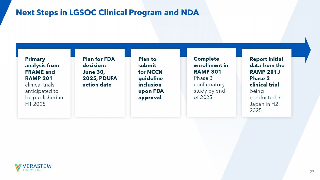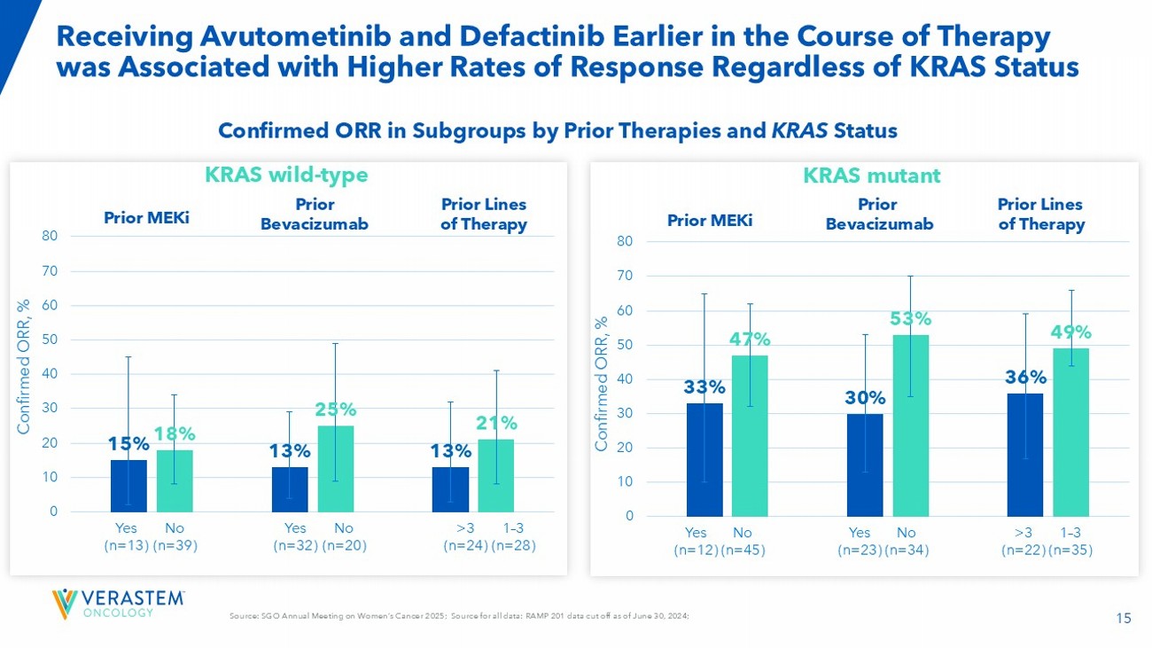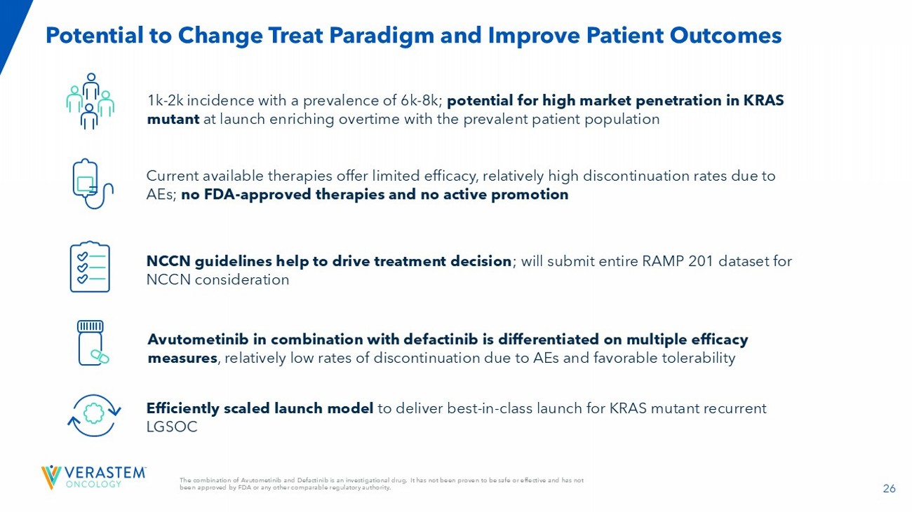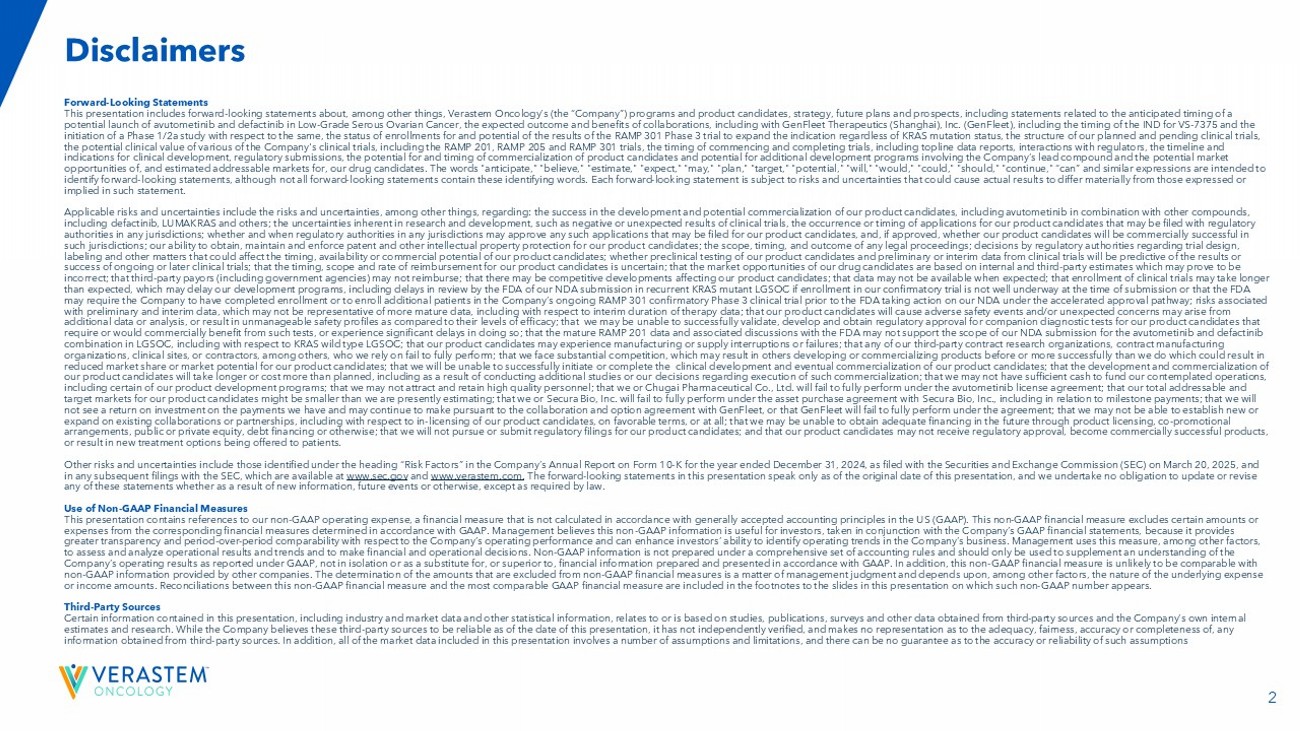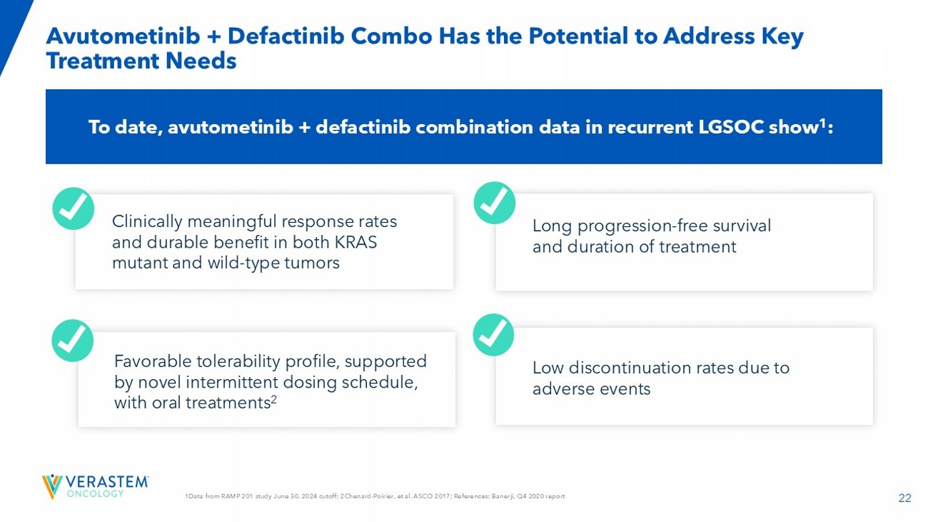 2 Forward - Looking Statements This presentation includes forward - looking statements about, among other things, Verastem Oncology’s (the “Company”) programs and product candidates, strategy, future plans and prospects, including statements relate d to the anticipated timing of a potential launch of avutometinib and defactinib in Low - Grade Serous Ovarian Cancer, the expected outcome and benefits of collaborations, including with GenFleet Therapeutics ( Shanghai), Inc. (GenFleet), including the timing of the IND for VS - 7375 and the initiation of a Phase 1/2a study with respect to the same, the status of enrollments for and potential of the results of the RAM P 301 Phase 3 trial to expand the indication regardless of KRAS mutation status, the structure of our planned and pending cli nic al trials, the potential clinical value of various of the Company's clinical trials, including the RAMP 201, RAMP 205 and RAMP 301 trial s, the timing of commencing and completing trials, including topline data reports, interactions with regulators, the timeline an d indications for clinical development, regulatory submissions, the potential for and timing of commercialization of product ca ndi dates and potential for additional development programs involving the Company’s lead compound and the potential market opportunities of, and estimated addressable markets for, our drug candidates. The words "anticipate," "believe," "estimate," "ex pect," "may," "plan," "target," "potential," "will," "would," "could," "should," "continue," “can” and similar expressions ar e i ntended to identify forward - looking statements, although not all forward - looking statements contain these identifying words. Each forward - l ooking statement is subject to risks and uncertainties that could cause actual results to differ materially from those expres sed or implied in such statement. Applicable risks and uncertainties include the risks and uncertainties, among other things, regarding: the success in the dev elo pment and potential commercialization of our product candidates, including avutometinib in combination with other compounds, including defactinib , LUMAKRAS and others; the uncertainties inherent in research and development, such as negative or unexpected results of clin ica l trials, the occurrence or timing of applications for our product candidates that may be filed with regulatory authorities in any jurisdictions; whether and when regulatory authorities in any jurisdictions may approve any such applicati ons that may be filed for our product candidates, and, if approved, whether our product candidates will be commercially successfu l in such jurisdictions; our ability to obtain, maintain and enforce patent and other intellectual property protection for our pro duc t candidates; the scope, timing, and outcome of any legal proceedings; decisions by regulatory authorities regarding trial de sig n, labeling and other matters that could affect the timing, availability or commercial potential of our product candidates; whet her preclinical testing of our product candidates and preliminary or interim data from clinical trials will be predictive of the re sults or success of ongoing or later clinical trials; that the timing, scope and rate of reimbursement for our product candidates is u nce rtain; that the market opportunities of our drug candidates are based on internal and third - party estimates which may prove to b e incorrect; that third - party payors (including government agencies) may not reimburse; that there may be competitive developments affecting our product candidates; that data may not be available when expected; that enrollment of clinical trials may take l on ger than expected, which may delay our development programs, including delays in review by the FDA of our NDA submission in recur ren t KRAS mutant LGSOC if enrollment in our confirmatory trial is not well underway at the time of submission or that the FDA may require the Company to have completed enrollment or to enroll additional patients in the Company’s ongoing RAMP 301 confi rma tory Phase 3 clinical trial prior to the FDA taking action on our NDA under the accelerated approval pathway; risks associate d with preliminary and interim data, which may not be representative of more mature data, including with respect to interim dur ati on of therapy data; that our product candidates will cause adverse safety events and/or unexpected concerns may arise from additional data or analysis, or result in unmanageable safety profiles as compared to their levels of efficacy; that we may be unable to successfully validate, develop and obtain regulatory approval for companion diagnostic tests for our product candid ate s that require or would commercially benefit from such tests, or experience significant delays in doing so; that the mature RAMP 201 da ta and associated discussions with the FDA may not support the scope of our NDA submission for the avutometinib and defactinib combination in LGSOC, including with respect to KRAS wild type LGSOC; that our product candidates may experience manufacturin g o r supply interruptions or failures; that any of our third - party contract research organizations, contract manufacturing organizations, clinical sites, or contractors, among others, who we rely on fail to fully perform; that we face substantial c omp etition, which may result in others developing or commercializing products before or more successfully than we do which could re sult in reduced market share or market potential for our product candidates; that we will be unable to successfully initiate or compl ete the clinical development and eventual commercialization of our product candidates; that the development and commercializatio n of our product candidates will take longer or cost more than planned, including as a result of conducting additional studies or our decisions regarding execution of such commercialization; that we may not ha