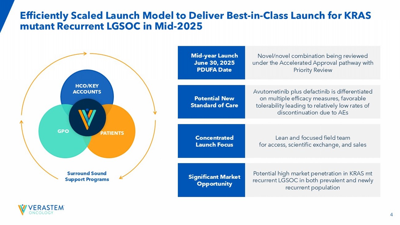 3 RAS: Rat Sarcoma; MAPK: Mitogen - activated protein kinases; FDA: Food and Drug Administration; LGSOC: Low - grade Serous Ovarian Cancer; PDUFA: Prescription Drug User Fee Act Verastem Oncology: Preparing to Commercialize First Novel RAS/MAPK/FAK Combo Asset with Billion - Dollar Addressable Market Opportunity Transitioning to commercial - stage company in 2025 focused on RAS/MAPK - driven cancers Avutometinib and defactinib combo has the potential to become the first and only FDA approved treatment for KRAS mutant recurrent Low - Grade Serous Ovarian Cancer (LGSOC) Discovery partnership with GenFleet Therapeutics on novel, potential best - in - class RAS pathway - related programs, including clinical stage KRAS G12D inhibitor, for additional value creation Market expansion opportunities with avutometinib + defactinib in first - line metastatic pancreatic cancer and advanced lung cancer FDA granted Priority Review with June 30, 2025, PDUFA Date