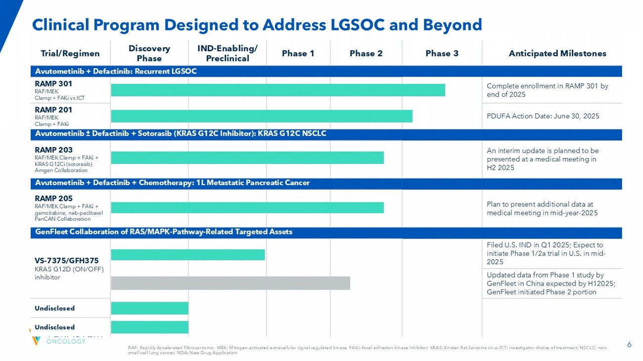 5 1 AACR Genie v16.1; 2 Cheasley et al., J Pathol 2021; 3 Thomson et al., Gynecol Oncol 2023; 4 Gershenson et al., Gynecol Oncol 2022; 5 Coma et al., AACR 2022 ; 6 Ishii et al., Cancer Res, 2013 ; 7 Lito et al., Cancer Cell, 2014 ; 8 Lubrano et al., AACR 2024 ; 9 Banerji et al., AACR 2020 ; 10 Jones et al., Invest New Drugs 2015; 11 McNamara et al., Gynecol Oncol 2024 ; 12 Banerjee et al., ASCO 2023 • 70% of LGSOC tumors are driven by RAS/MAPK pathway - associated mutations 1 - 4 • 30% are KRAS mutant with other mutations including NRAS, BRAF, NF1, and other RAS pathway - associated gene mutations • Avutometinib is an oral RAF/MEK clamp that potently inhibits MEK kinase activity while also blocking the compensatory reactivation of MEK by upstream RAF 5 - 7 • FAK is activated in response to MAPK pathway inhibition by avutometinib as well as by RAF inhibitors and MEK - only inhibitors 8, 9 • Defactinib is an oral selective FAK inhibitor that inhibits parallel pathway signaling and FAK inhibition has been demonstrated to enhance the antitumor efficacy of avutometinib both preclinically and clinically 10 - 12 • Together, avutometinib and defactinib have the potential to offer more complete blockade of the signaling that drives the growth of RAS/MAPK pathway - dependent tumors with the objective of deeper and more durable responses Avutometinib + Defactinib Aims to Inhibit Multiple Resistance Mechanisms in the RAS/MAPK Pathway to Improve Patient Outcomes ERK; extracellular signal - regulated kinase; FAK, focal adhesion kinase; MAPK, mitogen - activated protein kinase ; MEK, mitogen - activated extracellular signal - regulated kinase; mTOR, mammalian target of rapamycin; P, phosphate; PI3K, phosphatidylinositol 3 - kinase; R AF, rapidly accelerated fibrosarcoma; RAS, rat sarcoma virus; RhoA , Ras homolog family member A; RTK, receptor tyrosine kinase; YAP, Yes - associated protein. Inhibition of RAF/MEK activates FAK adaptive resistance * Not inclusive of all mutations.