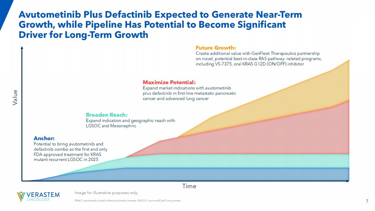 6 Anticipated Milestones Phase 3 Phase 2 Phase 1 IND - Enabling/ Preclinical Discovery Phase Trial/Regimen Avutometinib + Defactinib : Recurrent LGSOC Complete enrollment in RAMP 301 by end of 2025 RAMP 301 RAF/MEK Clamp + FAKi vs ICT PDUFA Action Date: June 30, 2025 RAMP 201 RAF/MEK Clamp + FAKi Avutometinib “ Defactinib + Sotorasib (KRAS G12C Inhibitor): KRAS G12C NSCLC An interim update is planned to be presented at a medical meeting in H2 2025 RAMP 203 RAF/MEK Clamp ± FAKi + KRAS G12Ci (sotorasib) Amgen Collaboration Avutometinib + Defactinib + Chemotherapy: 1L Metastatic Pancreatic Cancer Plan to present additional data at medical meeting in mid - year - 2025 RAMP 205 RAF/MEK Clamp + FAKi + gemcitabine, nab - paclitaxel PanCAN Collaboration GenFleet Collaboration of RAS/MAPK - Pathway - Related Targeted Assets Filed U.S. IND in Q1 2025; Expect to initiate Phase 1/2a trial in U.S. in mid - 2025 VS - 7375/GFH375 KRAS G12D (ON/OFF) inhibitor Updated data from Phase 1 study by GenFleet in China expected by H12025; GenFleet initiated Phase 2 portion Undisclosed Undisclosed RAF: Rapidly Accelerated Fibrosarcoma; MEK: Mitogen - activated extracellular signal - regulated kinase FAKi : focal adhesion kinase inhibitor; KRAS: Kirsten Rat Sarcoma virus ICT: investigator choice of treatment; NSCLC: non - small cell lung cancer; NDA: New Drug Application Clinical Program Designed to Address LGSOC and Beyond