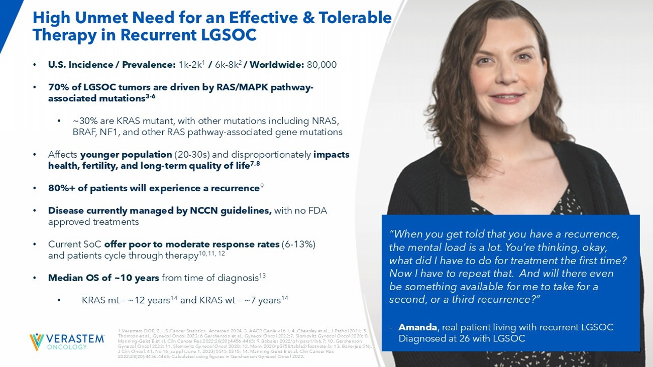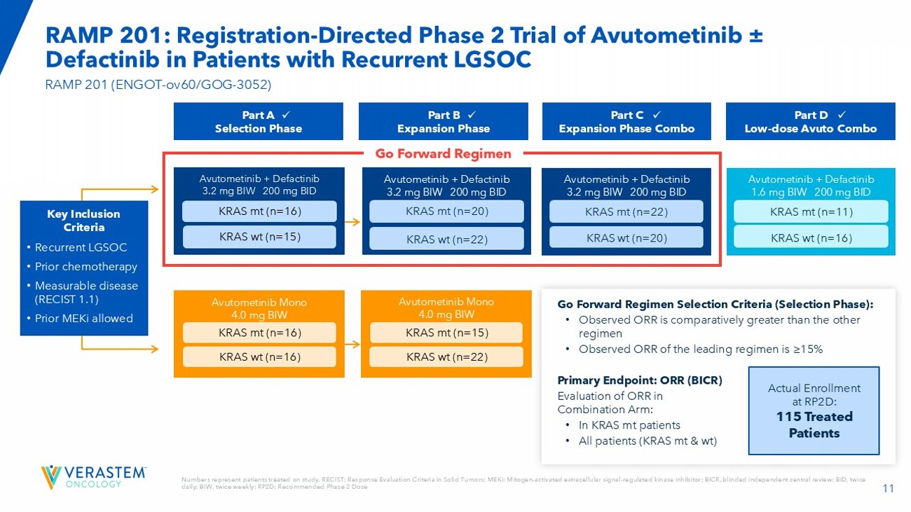 10 “When you get told that you have a recurrence, the mental load is a lot. You’re thinking, okay, what did I have to do for treatment the first time? Now I have to repeat that. And will there even be something available for me to take for a second, or a third recurrence?” - Amanda , real patient living with recurrent LGSOC Diagnosed at 26 with LGSOC High Unmet Need for an Effective & Tolerable Therapy in Recurrent LGSOC • U.S. Incidence / Prevalence: 1k - 2k 1 / 6k - 8k 2 / Worldwide: 80,000 • 70% of LGSOC tumors are driven by RAS/MAPK pathway - associated mutations 3 - 6 • ~30% are KRAS mutant, with other mutations including NRAS, BRAF, NF1, and other RAS pathway - associated gene mutations • Affects younger population (20 - 30s) and disproportionately impacts health, fertility, and long - term quality of life 7,8 • 80%+ of patients will experience a recurrence 9 • Disease currently managed by NCCN guidelines, with no FDA approved treatments • Current SoC offer poor to moderate response rates (6 - 13%) and patients cycle through therapy 10,11, 12 • Median OS of ~10 years from time of diagnosis 13 • KRAS mt – ~12 years 14 and KRAS wt – ~7 years 14 1. Verastem DOF; 2. US Cancer Statistics. Accessed 2024. 3. AACR Genie v16.1; 4. Cheasley et al., J Pathol 2021; 5 Thomson et al., Gynecol Oncol 2023; 6 Gershenson et al., Gynecol Oncol 2022; 7. Slomovitz Gynecol Oncol 2020; 8. Manning - Geist B et al. Clin Cancer Res 2022;28(20):4456 - 4465; 9. Babaier 2022/p1/para1/ln6,7; 10. Gershenson Gynecol Oncol 2022; 11. Slomovitz Gynecol Oncol 2020; 12. Monk 2020/p3758/table2/footnote - b; 13. Banerjee SN). J Clin Oncol. 41. No 16_suppl (June 1, 2023) 5515 - 5515; 14. Manning - Geist B et al. Clin Cancer Res 2022;28(20):4456 - 4465; Calculated using figures in Gershenson Gynecol Oncol 2022.