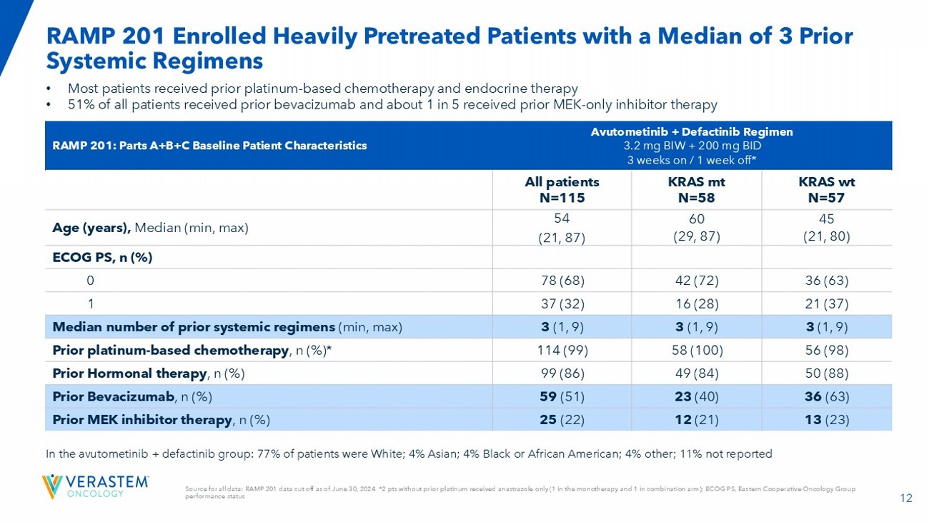 11 Numbers represent patients treated on study. RECIST: Response Evaluation Criteria in Solid Tumors; MEKi : Mitogen - activated extracellular signal - regulated kinase inhibitor; BICR, blinded independent central review; BID, twice daily; BIW, twice weekly; RP2D: Recommended Phase 2 Dose RAMP 201: Registration - Directed Phase 2 Trial of Avutometinib ± Defactinib in Patients with Recurrent LGSOC RAMP 201 (ENGOT - ov60/GOG - 3052) Key Inclusion Criteria • Recurrent LGSOC • Prior chemotherapy • Measurable disease (RECIST 1.1) • Prior MEKi allowed Avutometinib + Defactinib 3.2 mg BIW 200 mg BID KRAS mt (n=20) KRAS wt (n=22) Avutometinib + Defactinib 3.2 mg BIW 200 mg BID KRAS mt (n=22) KRAS wt (n=20) Avutometinib + Defactinib 1.6 mg BIW 200 mg BID Avutometinib + Defactinib 3.2 mg BIW 200 mg BID KRAS mt (n=16) KRAS wt (n=15) Go Forward Regimen Selection Criteria (Selection Phase): • Observed ORR is comparatively greater than the other regimen • Observed ORR of the leading regimen is ≥15% Primary Endpoint: ORR (BICR) Evaluation of ORR in Combination Arm: • In KRAS mt patients • All patients (KRAS mt & wt ) Actual Enrollment at RP2D: 115 Treated Patients Avutometinib Mono 4.0 mg BIW KRAS mt (n=15) KRAS wt (n=22) Avutometinib Mono 4.0 mg BIW KRAS mt (n=16) KRAS wt (n=16) Part A Selection Phase Part B Expansion Phase Part C Expansion Phase Combo Part D Low - dose Avuto Combo x x x x Go Forward Regimen KRAS mt (n=11) KRAS wt (n=16)