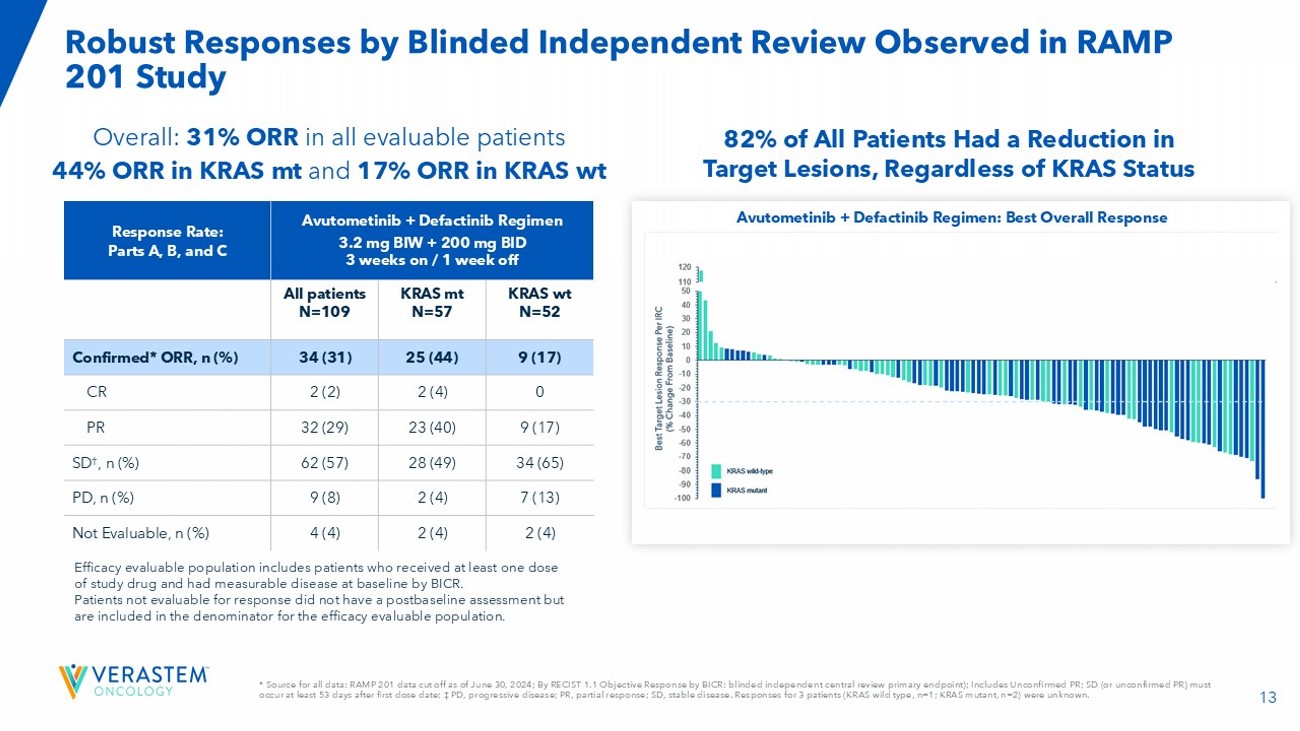 12 Avutometinib + Defactinib Regimen 3.2 mg BIW + 200 mg BID 3 weeks on / 1 week off* RAMP 201: Parts A+B+C Baseline Patient Characteristics KRAS wt N=57 KRAS mt N=58 All patients N=115 45 (21, 80) 60 (29, 87) 54 (21, 87) Age (years), Median (min, max) ECOG PS, n (%) 36 (63) 42 (72) 78 (68) 0 21 (37) 16 (28) 37 (32) 1 3 (1, 9) 3 (1, 9) 3 (1, 9) Median number of prior systemic regimens (min, max) 56 (98) 58 (100) 114 (99) Prior platinum - based chemotherapy , n (%)* 50 (88) 49 (84) 99 (86) Prior Hormonal therapy , n (%) 36 (63) 23 (40) 59 (51) Prior Bevacizumab , n (%) 13 (23) 12 (21) 25 (22) Prior MEK inhibitor therapy , n (%) • Most patients received prior platinum - based chemotherapy and endocrine therapy • 51% of all patients received prior bevacizumab and about 1 in 5 received prior MEK - only inhibitor therapy In th e avutometinib + defactinib group: 77% of patients were White; 4% Asian ; 4% Black or African American; 4% other; 11% not reported Source for all data: RAMP 201 data cut off as of June 30, 2024 *2 pts without prior platinum received anastrazole only (1 in the monotherapy and 1 in combination arm); ECOG PS, Eastern Cooperative Oncology Group performance status RAMP 201 Enrolled Heavily Pretreated Patients with a Median of 3 Prior Systemic Regimens