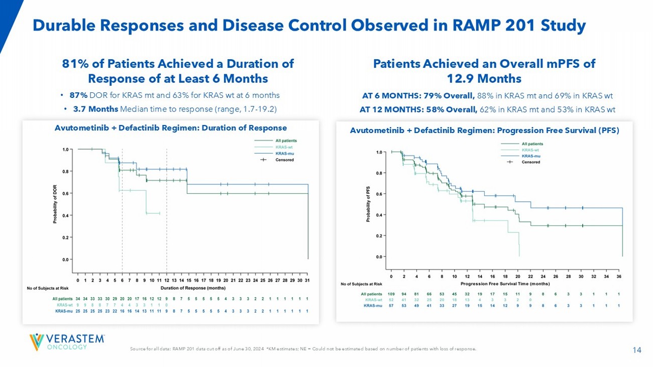13 Avutometinib + Defactinib Regimen 3.2 mg BIW + 200 mg BID 3 weeks on / 1 week off Response Rate: Parts A, B, and C KRAS wt N=52 KRAS mt N=57 All patients N=109 9 (17) 25 (44) 34 (31) Confirmed* ORR, n (%) 0 2 (4) 2 (2) CR 9 (17) 23 (40) 32 (29) PR 34 (65) 28 (49) 62 (57) SD † , n (%) 7 (13) 2 (4) 9 (8) PD, n (%) 2 (4) 2 (4) 4 (4) Not Evaluable, n (%) Overall: 31% ORR in all evaluable patients 44% ORR in KRAS mt and 17% ORR in KRAS wt Efficacy evaluable population includes patients who received at least one dose of study drug and had measurable disease at baseline by BICR. Patients not evaluable for response did not have a postbaseline assessment but are included in the denominator for the efficacy evaluable population. * Source for all data: RAMP 201 data cut off as of June 30, 2024; By RECIST 1.1 Objective Response by BICR: blinded independe nt central review primary endpoint); Includes Unconfirmed PR; SD (or unconfirmed PR) must occur at least 53 days after first dose date; ‡ PD, progressive disease; PR, partial response; SD, stable disease. Responses for 3 patients (KRAS wild type, n=1; KRAS mutant, n=2) were unknown. Robust Responses by Blinded Independent Review Observed in RAMP 201 Study Avutometinib + Defactinib Regimen: Best Overall Response 82% of All Patients Had a Reduction in Target Lesions, Regardless of KRAS Status