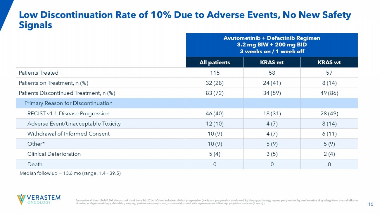 15 Source: SGO Annual Meeting on Women’s Cancer 2025; Source for all data: RAMP 201 data cut off as of June 30, 2024; Receiving Avutometinib and Defactinib Earlier in the Course of Therapy was Associated with Higher Rates of Response Regardless of KRAS Status 15 % 13 % 13 % 18 % 25 % 21 % 0 10 20 30 40 50 60 70 80 Confirmed ORR, % Yes (n=13) No (n=39) Yes (n=32) No (n=20) >3 (n=24) 1 – 3 (n=28) Prior MEKi Prior Bevacizumab Prior Lines of Therapy 33 % 30 % 36 % 47 % 53 % 49 % 0 10 20 30 40 50 60 70 80 Confirmed ORR, % Yes (n=12) No (n=45) Yes (n=23) No (n=34) >3 (n=22) 1 – 3 (n=35) Prior MEKi Prior Bevacizumab Prior Lines of Therapy Confirmed ORR in Subgroups by Prior Therapies and KRAS Status KRAS mutant KRAS wild - type