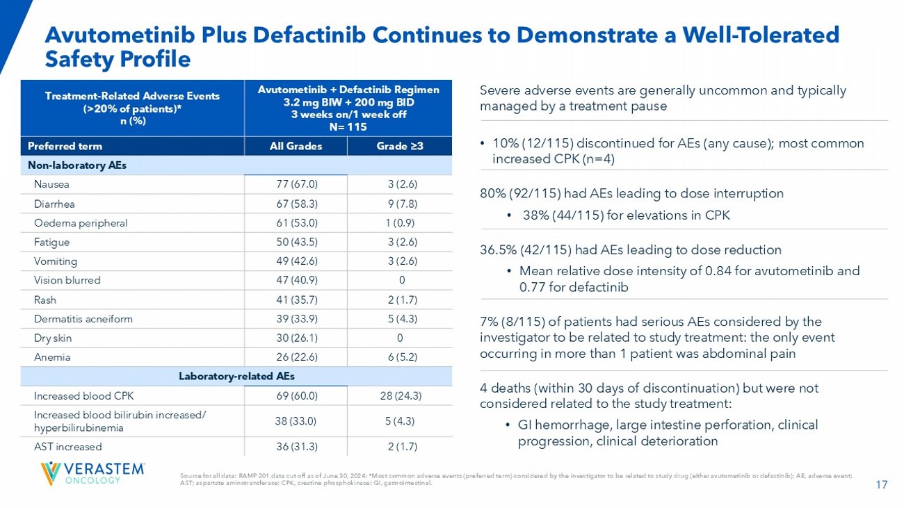 16 Median follow - up = 13.6 mo (range, 1.4 – 39.5) Avutometinib + Defactinib Regimen 3.2 mg BIW + 200 mg BID 3 weeks on / 1 week off KRAS wt KRAS mt All patients 57 58 115 Patients Treated 8 (14) 24 (41) 32 (28) Patients on Treatment, n (%) 49 (86) 34 (59) 83 (72) Patients Discontinued Treatment, n (%) Primary Reason for Discontinuation 28 (49) 18 (31) 46 (40) RECIST v1.1 Disease Progression 8 (14) 4 (7) 12 (10) Adverse Event/Unacceptable Toxicity 6 (11) 4 (7) 10 (9) Withdrawal of Informed Consent 5 (9) 5 (9) 10 (9) Other* 2 (4) 3 (5) 5 (4) Clinical Deterioration 0 0 0 Death Source for all data: RAMP 201 data cut off as of June 30, 2024; *Other includes: clinical progression (n=8) and progression c onf irmed by biopsy/pathology report, progression by confirmation of cytology from pleural effusion showing malignant etiology, debulking surgery, patient noncompliance, patient withdrawal with agreement to follow - up, physician decision (1 each).; Low Discontinuation Rate of 10% Due to Adverse Events, No New Safety Signals