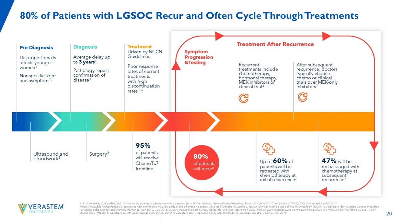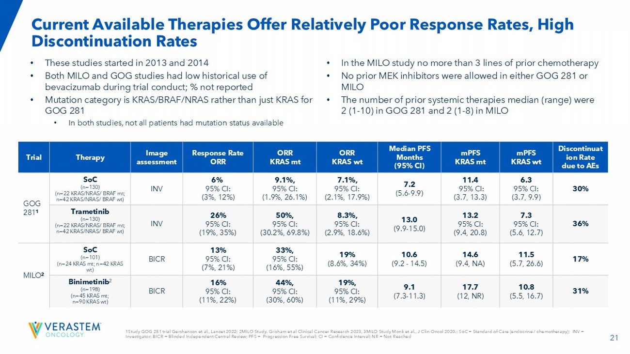 20 Pre - Diagnosis Disproportionally affects younger women 1 Nonspecific signs and symptoms 2 Symptom Progression & Testing Treatment After Recurrence 1. B. Slomovitz , C. Gourley, M.S. Carey, et al., Low - grade serous ovarian cancer: State of the science, Gynecologic Oncology, https:// doi.org /10.1016/j.ygyno.2019.12.033; 2. Harvard Health 2017. https:// www.health.harvard.edu /cancer/certain - symptoms - may - be - early - signs - of - ovarian - cancer. Assessed October 8, 2024; 3. NCCN Clinical Practice Guidelines i n Oncology: (NCCN Guidelines®) for Ovarian Cancer Including Fallopian Tube Cancer and Primary Peritoneal Cancer V. 3.2024; 4. LGSOC Patient Impact Survey Research Findings, Harris Poll 202 3. https:// www.businesswire.com /news/home/20231107926726/ en /; 5. Monk BJ et al. J Clin Oncol 2020 (MILO); 6. Gershenson DM et al. Lancet 2022 (GOG 281); 7. Verastem DOF. Demand Study March 2024. \ ; 8. Gershenson et al J Clin Oncol 2015 80% of Patients with LGSOC Recur and Often Cycle Through Treatments Diagnosis Average delay up to 3 years 4 Pathology report confirmation of disease 3 Treatment Driven by NCCN Guidelines Poor r esponse rates of current treatments w ith high discontinuation rates 5,6 Ultrasound and bloodwork 3 Surgery 3 95% of patients will receive ChemoTx7 frontline Recurrent treatments include chemotherapy, hormonal therapy, MEK inhibitors or clinical trial 3 After subsequent recurrence, doctors typically choose chemo or clinical trials over MEK - only inhibitors 7 Up to 60% of patients will be retreated with chemotherapy at initial recurrence 7 47% will be rechallenged with chemotherapy at subsequent recurrence 7 &UHDWHG E\ 5DQDK 3L[HO 6WXGLR IURP WKH 1RXQ 3URMHFW 80% of patients will recur 8