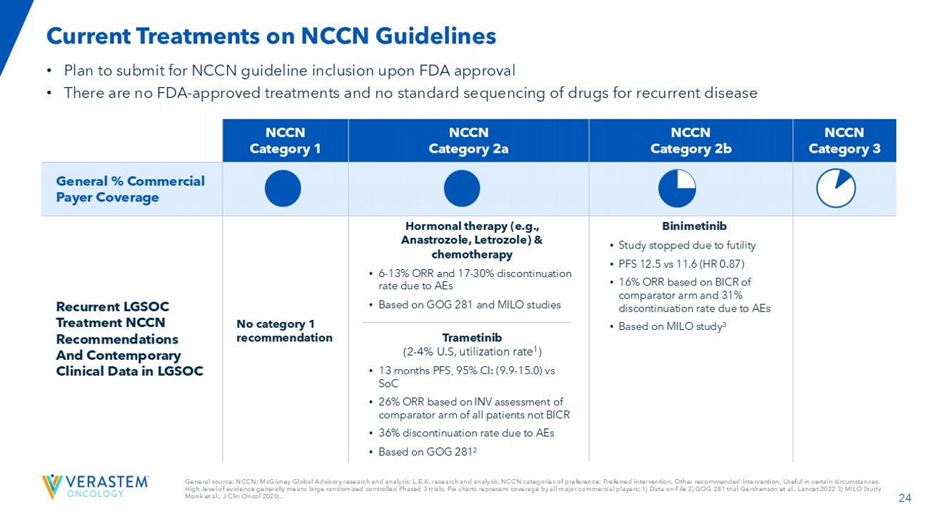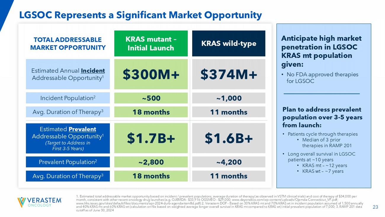 23 1. Estimated total addressable market opportunity based on incident / prevalent populations, average duration of therapy (as obs erved in VSTM clinical trials) and cost of therapy of $34,000 per month, consistent with other recent oncology drug launches (e.g. OJEMDA - $33,916 OGSIVEO - $29,000; www.dayonebio.com/wp - conten t/uploads/Ojemda - Connecticut_VF.pdf; www.hhs.texas.gov/sites/default/files/documents/apr - 2024 - durb - agenda - item8d.pdf) 2. Verastem DOF – Based on 30% KRAS mt and 70% KRAS wt in incident population assumed of 1,500 annually and 40% KRAS mt and 60% KRAS wt (calculation on file based on weighted average longer overall survival in KRAS mt compared to KRAS wt ) initial prevalent population of 7,000; 3. RAMP 201 data cutoff as of June 30, 2024 LGSOC Represents a Significant Market Opportunity KRAS mutant – Initial Launch KRAS wild - type Estimated Prevalent Addressable Opportunity 1 (Target to Address in First 3 - 5 Years) Prevalent Population 2 Avg. Duration of Therapy 3 Estimated Annual Incident Addressable Opportunity 1 Incident Population 2 Avg. Duration of Therapy 3 $1.7B+ $1.6B+ ~2,800 ~4,200 18 months 11 months $300M+ $374M+ ~500 ~1,000 18 months 11 months TOTAL ADDRESSABLE MARKET OPPORTUNITY Anticipate high market penetration in LGSOC KRAS mt population given: • No FDA approved therapies for LGSOC Plan to address prevalent population over 3 - 5 years from launch: • Patients cycle through therapies • Median of 3 prior therapies in RAMP 201 • Long overall survival in LGSOC patients at ~10 years • KRAS mt – ~12 years • KRAS wt – ~7 years