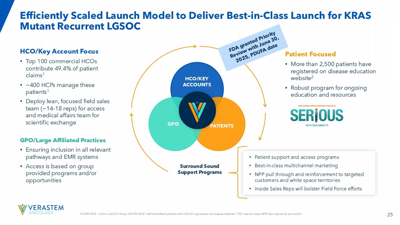 24 General source: NCCN; McGivney Global Advisory research and analysis; L.E.K. research and analysis. NCCN categories of prefer enc e: Preferred intervention, Other recommended intervention, Useful in certain circumstances. High - level of evidence generally means large randomized controlled Phased 3 trials; Pie charts represent coverage by all major c ommercial players; 1) Data on File 2) GOG 281 trial Gershenson et al., Lancet 2022 ​ 3) MILO Study Monk et al., J Clin Oncol 2020;. • Plan to submit for NCCN guideline inclusion upon FDA approval • There are no FDA - approved treatments and no standard sequencing of drugs for recurrent disease Current Treatments on NCCN Guidelines NCCN Category 3 NCCN Category 2b NCCN Category 2a NCCN Category 1 General % Commercial Payer Coverage Binimetinib • Study stopped due to futility • PFS 12.5 vs 11.6 (HR 0.87) • 16% ORR based on BICR of comparator arm and 31% discontinuation rate due to AEs • Based on MILO study 3 Hormonal therapy (e.g., Anastrozole, Letrozole) & chemotherapy • 6 - 13% ORR and 17 - 30% discontinuation rate due to AEs • Based on GOG 281 and MILO studies Trametinib (2 - 4% U.S, utilization rate 1 ) • 13 months PFS, 95% CI: (9.9 - 15.0) vs SoC • 26% ORR based on INV assessment of comparator arm of all patients not BICR • 36% discontinuation rate due to AEs • Based on GOG 281 2 No category 1 recommendation Recurrent LGSOC Treatment NCCN Recommendations And Contemporary Clinical Data in LGSOC