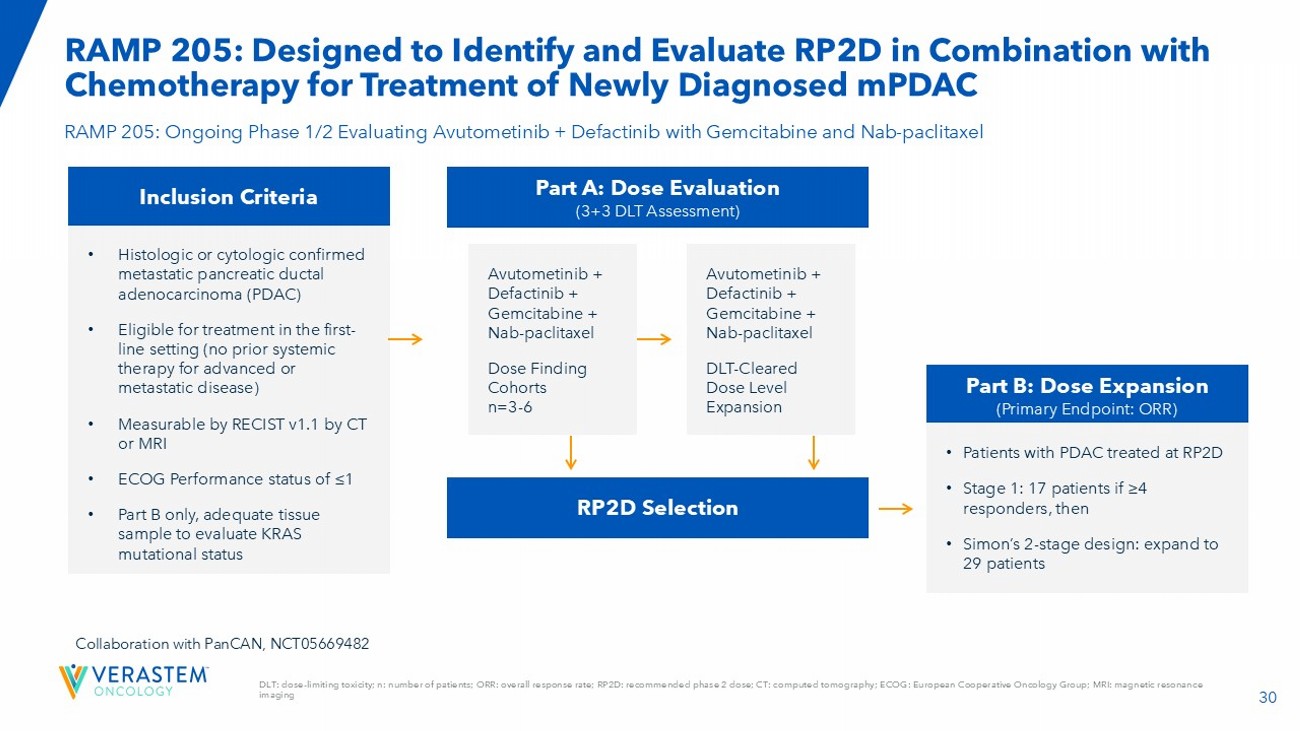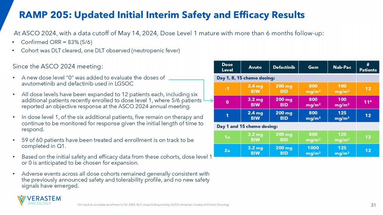 30 DLT: dose - limiting toxicity; n: number of patients; ORR: overall response rate; RP2D: recommended phase 2 dose; CT: computed tom ography; ECOG: European Cooperative Oncology Group; MRI: magnetic resonance imaging RAMP 205: Designed to Identify and Evaluate RP2D in C ombination with Chemotherapy for Tr eatment of Newly Diagnosed mPDAC RAMP 205: Ongoing Phase 1/2 Evaluating Avutometinib + Defactinib with Gemcitabine and Nab - paclitaxel Inclusion Criteria • Histologic or cytologic confirmed metastatic pancreatic ductal adenocarcinoma (PDAC) • Eligible for treatment in the first - line setting (no prior systemic therapy for advanced or metastatic disease) • Measurable by RECIST v1.1 by CT or MRI • ECOG Performance status of ≤1 • Part B only, adequate tissue sample to evaluate KRAS mutational status Collaboration with PanCAN , NCT05669482 ​ Part A: Dose Evaluation (3+3 DLT Assessment) RP2D Selection Part B: Dose Expansion (Primary Endpoint: ORR) Avutometinib + Defactinib + Gemcitabine + Nab - paclitaxel Dose Finding Cohorts n=3 - 6 Avutometinib + Defactinib + Gemcitabine + Nab - paclitaxel DLT - Cleared Dose Level Expansion • Patients with PDAC treated at RP2D • Stage 1: 17 patients if ≥4 responders, then • Simon’s 2 - stage design: expand to 29 patients