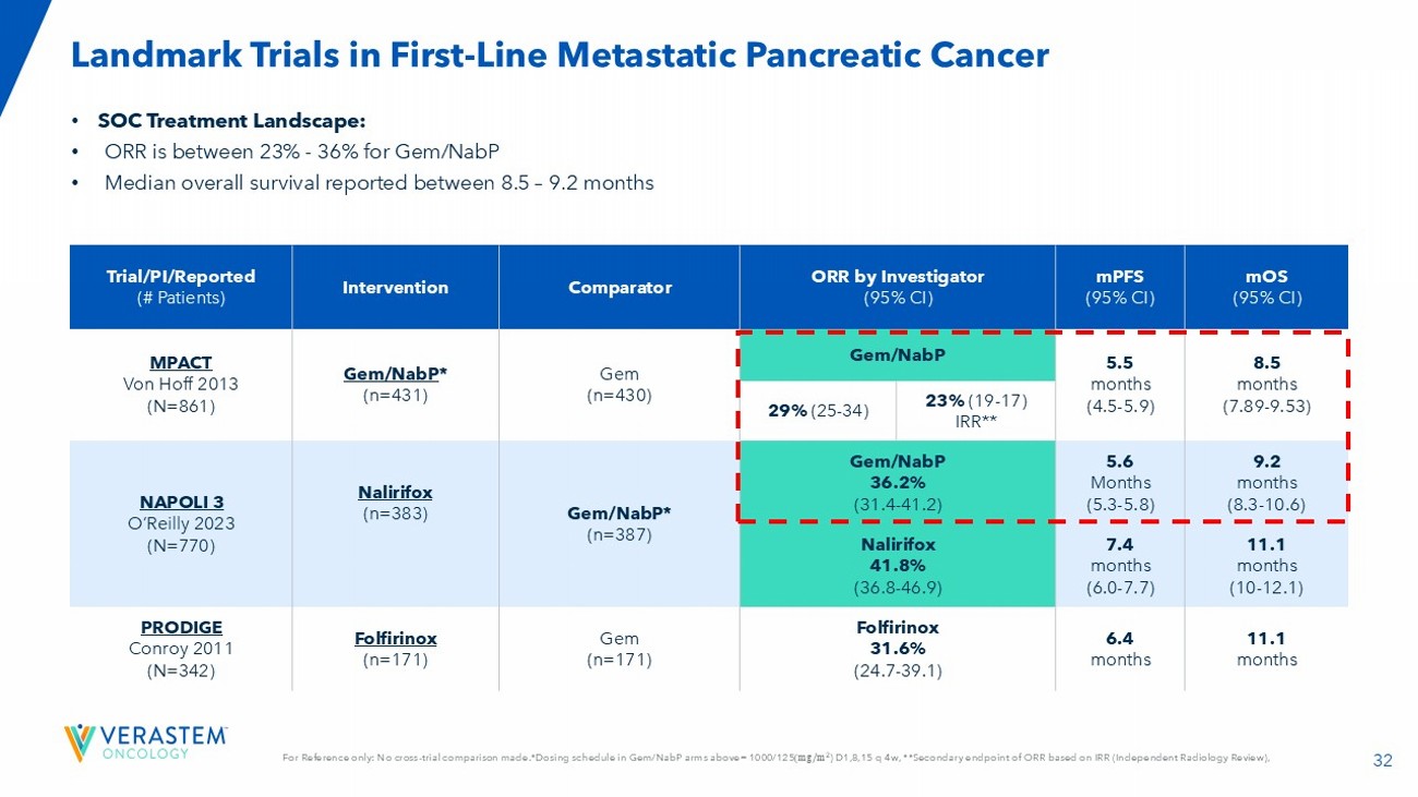 32 For Reference only: No cross - trial comparison made.*Dosing schedule in Gem/ NabP arms above= 1000/125 ሺ ‰ Ȁ  ଶ ) D1,8,15 q 4w, **Secondary endpoint of ORR based on IRR (Independent Radiology Review), • SOC Treatment Landscape: • ORR is between 23% - 36% for Gem/ NabP • Median overall survival reported between 8.5 – 9.2 months Landmark Trials in First - Line Metastatic Pancreatic Cancer mOS (95% CI) mPFS (95% CI) ORR by Investigator (95% CI) Comparator Intervention Trial/PI/Reported (# Patients) 8.5 months (7.89 - 9.53) 5.5 months (4.5 - 5.9) Gem/NabP Gem (n=430) Gem/NabP * (n=431) MPACT Von Hoff 2013 (N=861) 23% (19 - 17) IRR** 29% (25 - 34) 9.2 months (8.3 - 10.6) 5.6 Months (5.3 - 5.8) Gem/NabP 36.2% (31.4 - 41.2) Gem/ NabP * (n=387) Nalirifox (n=383) NAPOLI 3 O’Reilly 2023 (N=770) 11.1 months (10 - 12.1) 7.4 months (6.0 - 7.7) Nalirifox 41.8% (36.8 - 46.9) 11.1 months 6.4 months Folfirinox 31.6% (24.7 - 39.1) Gem (n=171) Folfirinox (n=171) PRODIGE Conroy 2011 (N=342)