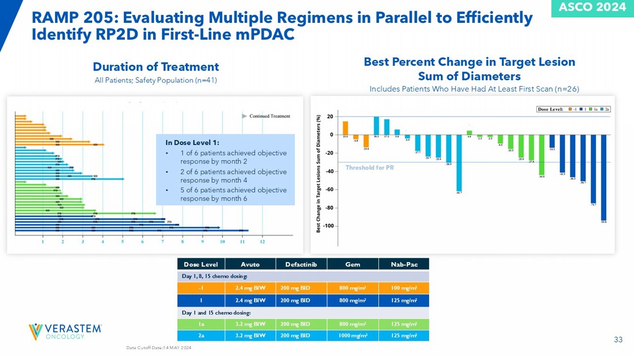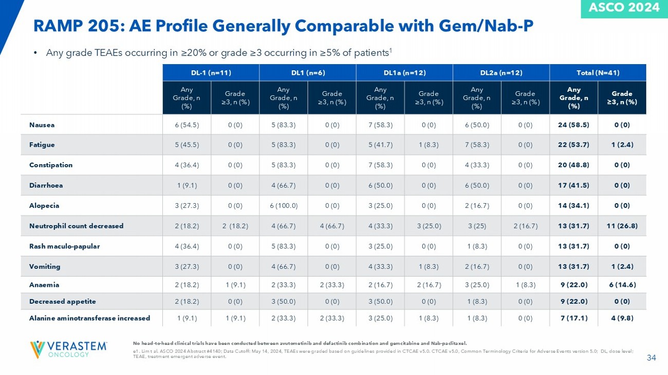 33 Data Cutoff Date:14 MAY 2024 RAMP 205: Evaluating Multiple Regimens in Parallel to Efficiently Identify RP2D in First - Line mPDAC Nab - Pac Gem Defactinib Avuto Dose Level Day 1, 8, 15 chemo dosing: 100 mg/m 2 800 mg/m 2 200 mg BID 2.4 mg BIW - 1 125 mg/m 2 800 mg/m 2 200 mg BID 2.4 mg BIW 1 Day 1 and 15 chemo dosing: 125 mg/m 2 800 mg/m 2 200 mg BID 3.2 mg BIW 1a 125 mg/m 2 1000 mg/m 2 200 mg BID 3.2 mg BIW 2a In Dose Level 1: • 1 of 6 patients achieved objective response by month 2 • 2 of 6 patients achieved objective response by month 4 • 5 of 6 patients achieved objective response by month 6 Best Percent Change in Target Lesion Sum of Diameters Includes Patients Who Have Had At Least First Scan (n=26) Threshold for PR All Patients; Safety Population (n=41) Duration of Treatment ASCO 2024