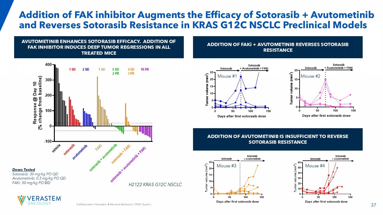 37 Collaboration Verastem & Mariano Barbacid , CNIO (Spain) Addition of FAK inhibitor Augments the Efficacy of Sotorasib + Avutometinib and Reverses Sotorasib Resistance in KRAS G12C NSCLC Preclinical Models AVUTOMETINIB ENHANCES SOTORASIB EFFICACY. ADDITION OF FAK INHIBITOR INDUCES DEEP TUMOR REGRESSIONS IN ALL TREATED MICE ADDITION OF FAKi + AVUTOMETINIB REVERSES SOTORASIB RESISTANCE ADDITION OF AVUTOMETINIB IS INSUFFICIENT TO REVERSE SOTORASIB RESISTANCE -100 0 100 200 300 400 Response at Day 10 R e s p o n s e @ D a y 1 0 ( % c h a n g e f r o m b a s e l i n e ) v e h i c l e 10 PR a v u t o m e t i n i b F A K i s o t o r a s i b s o t o r a s i b + a v u t o m e t i n i b s o t o r a s i b + F A K i s o t o r a s i b + a v u t o m e t i n i b + F A K i 2 SD 1 SD1 SD 8 SD 2 PR 4 SD 3 PR Doses Tested Sotorasib : 30 mg/kg PO QD Avutometinib : 0.3 mg/kg PO QD FAKi : 50 mg/kg PO BID H2122 KRAS G12C NSCLC 0 50 100 150 0 5 10 15 20 25 Days after first sotorasib dose T u m o r v o l u m e ( m m 3 ) Sotorasib + Avutometinib + FAKiSotorasib 0 50 100 150 0 5 10 15 20 25 Days after first sotorasib dose T u m o r v o l u m e ( m m 3 ) Sotorasib + Avutometinib Sotorasib Mouse #1 Mouse #2 Mouse #3 Mouse #4