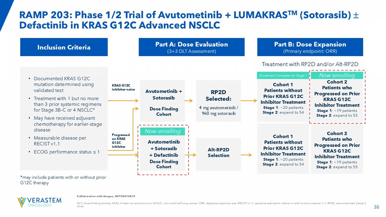 38 Collaboration with Amgen, NCT05074810 DLT, dose - limiting toxicity; KRAS, kristen rat sarcoma virus; NSCLC, non - small cell lung cancer; ORR, objective response rate; RECIST v1.1, response evaluation criteria i n solid tumours version 1.1; RP2D, recommended phase 2 dose. RAMP 203: Phase 1/2 Trial of Avutometinib + LUMAKRAS TM ( Sotorasib ) Defactinib in KRAS G12C Advanced NSCLC Inclusion Criteria • Documented KRAS G12C mutation determined using validated test • Treatment with 1 but no more than 3 prior systemic regimens for Stage 3B - C or 4 NSCLC* • May have received adjuvant chemotherapy for earlier - stage disease • Measurable disease per RECIST v1.1 • ECOG performance status ≤ 1 Part A: Dose Evaluation (3+3 DLT Assessment) Avutometinib + Sotorasib Dose Finding Cohort Part B: Dose Expansion (Primary endpoint: ORR) RP2D Selected: 4 mg a vutometinib / 960 mg sotorasib Avutometinib + Sotorasib + Defactinib Dose Finding Cohort Alt - RP2D Selection KRAS G12C inhibitor - naive Progressed on KRAS G12C inhibitor Now enrolling Cohort 1 Patients without Prior KRAS G12C Inhibitor Treatment Stage 1 : ~20 patients Stage 2 : expand to 54 Cohort 2 Patients who Progressed on Prior KRAS G12C Inhibitor Treatment Stage 1 : ~19 patients Stage 2 : expand to 55 Cohort 1 Patients without Prior KRAS G12C Inhibitor Treatment Stage 1 : ~20 patients Stage 2 : expand to 54 Cohort 2 Patients who Progressed on Prior KRAS G12C Inhibitor Treatment Stage 1 : ~19 patients Stage 2 : expand to 55 Enrollment Complete for Stage 1 Now enrolling *may include patients with or without prior G12C therapy Treatment with RP2D and/or Alt - RP2D