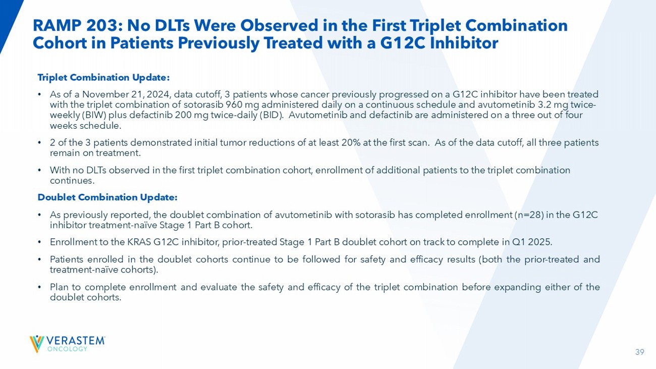 39 RAMP 203: No DLTs Were Observed in the First Triplet Combination Cohort in Patients Previously Treated with a G12C Inhibitor Triplet Combination Update: • As of a November 21, 2024 , data cutoff, 3 patients whose cancer previously progressed on a G12C inhibitor have been treated with the triplet combination of sotorasib 960 mg administered daily on a continuous schedule and avutometinib 3.2 mg twice - weekly (BIW) plus defactinib 200 mg twice - daily (BID). Avutometinib and defactinib are administered on a three out of four weeks schedule. ​ • 2 of the 3 patients demonstrated initial tumor reductions of at least 20% at the first scan. As of the data cutoff, all three patients remain on treatment. ​ • With no DLTs observed in the first triplet combination cohort, enrollment of additional patients to the triplet combination continues. Doublet Combination Update: • As previously reported, the doublet combination of avutometinib with sotorasib has completed enrollment (n=28) in the G12C inhibitor treatment - naïve Stage 1 Part B cohort. ​ • Enrollment to the KRAS G 12 C inhibitor, prior - treated Stage 1 Part B doublet cohort on track to complete in Q 1 2025 . • Patients enrolled in the doublet cohorts continue to be followed for safety and efficacy results (both the prior - treated and treatment - naïve cohorts) . • Plan to complete enrollment and evaluate the safety and efficacy of the triplet combination before expanding either of the doublet cohorts .