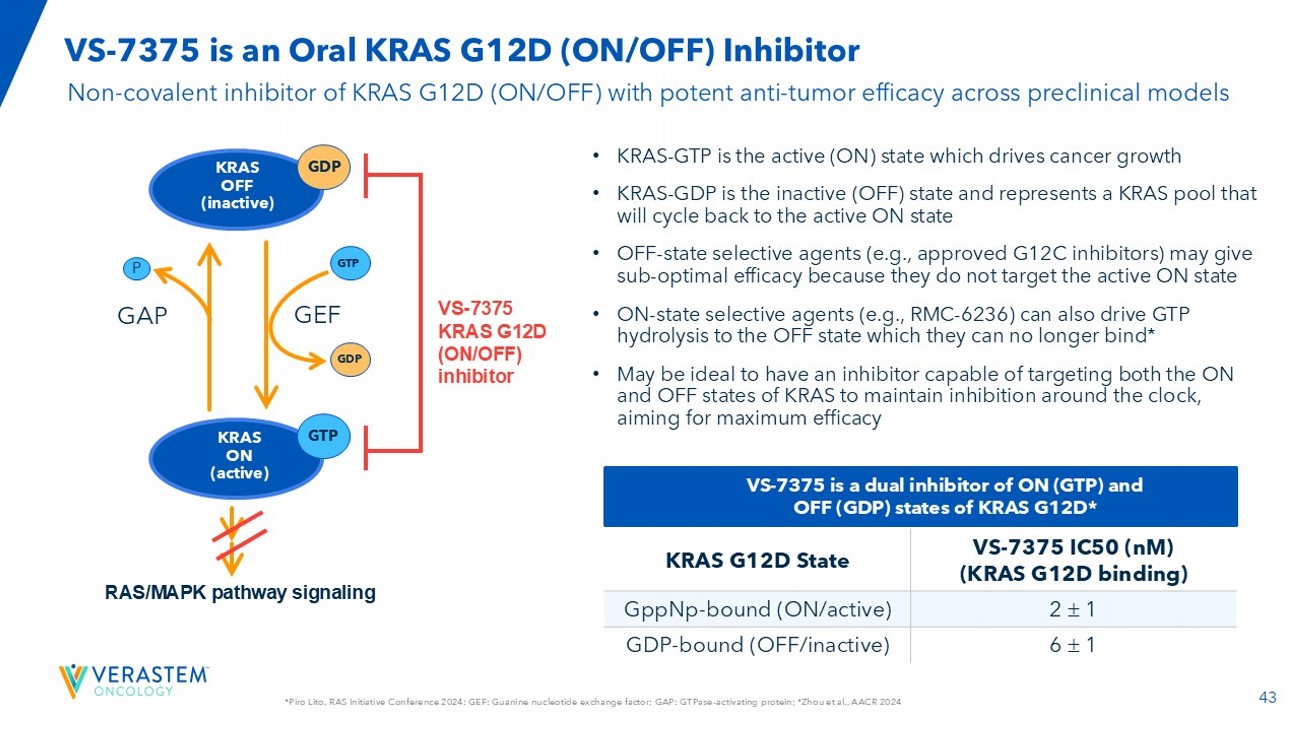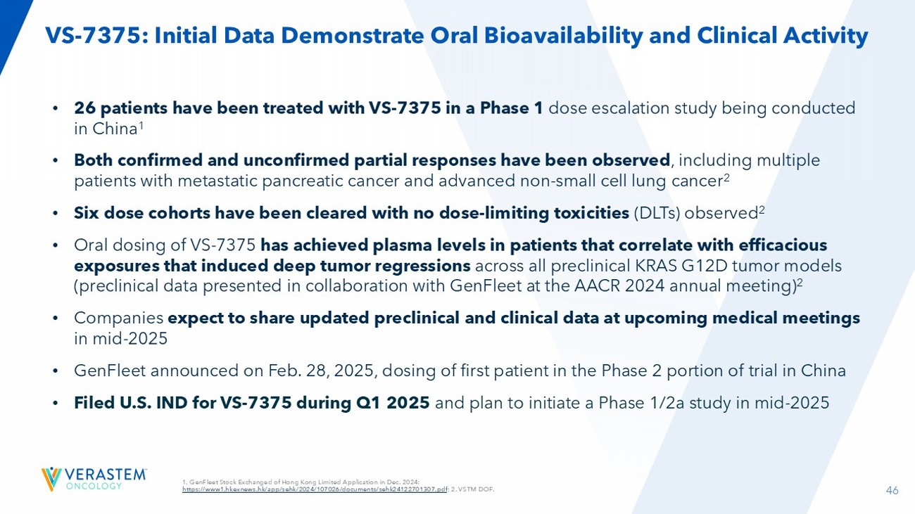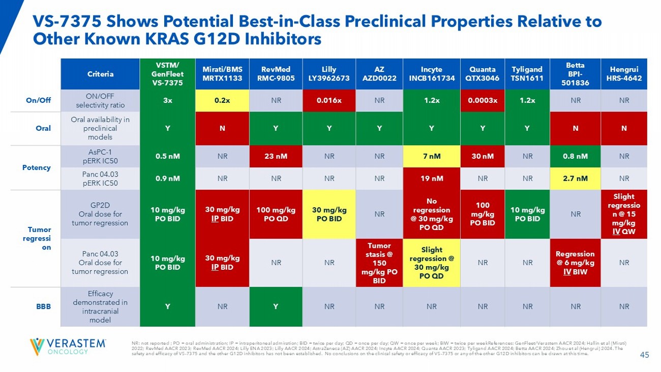 45 NR: not reported ; PO = oral administration; IP = intraperitoneal admiration; BID = twice per day; QD = once per day; QW = on ce per week; BIW = twice per weekReferences : GenFleet / Verastem AACR 2024; Hallin et al (Mirati) 2022; RevMed AACR 2023; RevMed AACR 2024; Lilly ENA 2023; Lilly AACR 2024; AstraZeneca (AZ) AACR 2024; Incyte AACR 2024; Quanta AACR 2023; Tyligand AACR 2024; Betta AACR 2024; Zhou et al ( Hengrui ) 2024. The safety and efficacy of VS - 7375 and the other G12D inhibitors has not been established. No conclusions on the clinical safety or efficacy of VS - 7375 or any of the other G12D inhibitors can be drawn at this time. VS - 7375 Shows Potential Best - in - Class Preclinical Properties Relative to Other Known KRAS G12D Inhibitors Hengrui HRS - 4642 Betta BPI - 501836 Tyligand TSN1611 Quanta QTX3046 Incyte INCB161734 AZ AZD0022 Lilly LY3962673 RevMed RMC - 9805 Mirati/BMS MRTX1133 VSTM/ GenFleet VS - 7375 Criteria NR NR 1.2x 0.0003x 1.2x NR 0.016x NR 0.2x 3x ON/OFF selectivity ratio On/Off N N Y Y Y Y Y Y N Y Oral availability in preclinical models Oral NR 0.8 nM NR 30 nM 7 nM NR NR 23 nM NR 0.5 nM AsPC - 1 pERK IC50 Potency NR 2.7 nM NR NR 19 nM NR NR NR NR 0.9 nM Panc 04.03 pERK IC50 Slight regressio n @ 15 mg/kg IV QW NR 10 mg/kg PO BID 100 mg/kg PO BID No regression @ 30 mg/kg PO QD NR 30 mg/kg PO BID 100 mg/kg PO QD 30 mg/kg IP BID 10 mg/kg PO BID GP2D Oral dose for tumor regression Tumor regressi on NR Regression @ 6 mg/kg IV BIW NR NR Slight regression @ 30 mg/kg PO QD Tumor stasis @ 150 mg/kg PO BID NR NR 30 mg/kg IP BID 10 mg/kg PO BID Panc 04.03 Oral dose for tumor regression NR NR NR NR NR NR NR Y NR Y Efficacy demonstrated in intracranial model BBB