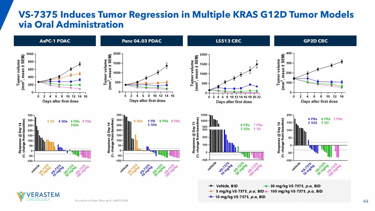 43 *Piro Lito, RAS Initiative Conference 2024; GEF: Guanine nucleotide exchange factor; GAP: GTPase - activating protein; *Zhou et al ., AACR 2024 VS - 7375 is an Oral KRAS G12D (ON/OFF) Inhibitor GEF GTP GDP GTP GDP RAS/MAPK pathway signaling GAP P KRAS OFF (inactive) KRAS ON (active) VS - 7375 KRAS G12D (ON/OFF) inhibitor VS - 7375 IC50 ( nM ) (KRAS G12D binding) KRAS G12D State 2 1 GppNp - bound (ON/active) 6 1 GDP - bound (OFF/inactive) VS - 7375 is a dual inhibitor of ON (GTP) and OFF (GDP) states of KRAS G12D* Non - covalent inhibitor of KRAS G12D (ON/OFF) with potent anti - tumor efficacy across preclinical models • KRAS - GTP is the active (ON) state which drives cancer growth • KRAS - GDP is the inactive (OFF) state and represents a KRAS pool that will cycle back to the active ON state • OFF - state selective agents (e.g., approved G12C inhibitors) may give sub - optimal efficacy because they do not target the active ON state • ON - state selective agents (e.g., RMC - 6236) can also drive GTP hydrolysis to the OFF state which they can no longer bind* • May be ideal to have an inhibitor capable of targeting both the ON and OFF states of KRAS to maintain inhibition around the clock, aiming for maximum efficacy