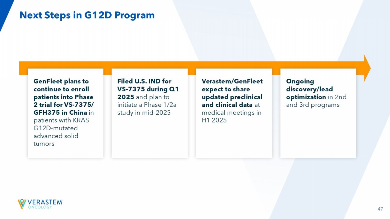 46 VS - 7375: Initial Data Demonstrate Oral Bioavailability and Clinical Activity • 26 patients have been treated with VS - 7375 in a Phase 1 dose escalation study being conducted in China 1 • Both confirmed and unconfirmed partial responses have been observed , including multiple patients with metastatic pancreatic cancer and advanced non - small cell lung cancer 2 • Six dose cohorts have been cleared with no dose - limiting toxicities (DLTs) observed 2 • Oral dosing of VS - 7375 has achieved plasma levels in patients that correlate with efficacious exposures that induced deep tumor regressions across all preclinical KRAS G12D tumor models (preclinical data presented in collaboration with GenFleet at the AACR 2024 annual meeting ) 2 • Companies expect to share updated preclinical and clinical data at upcoming medical meetings in mid - 2025 • GenFleet announced on Feb. 28, 2025, dosing of first patient in the Phase 2 portion of trial in China • Filed U.S. IND for VS - 7375 during Q1 2025 and plan to initiate a Phase 1/2a study in mid - 2025 1. GenFleet Stock Exchanged of Hong Kong Limited Application in Dec. 2024: https://www1.hkexnews.hk/app/sehk/2024/107026/documents/sehk24122701307.pdf ; 2. VSTM DOF.