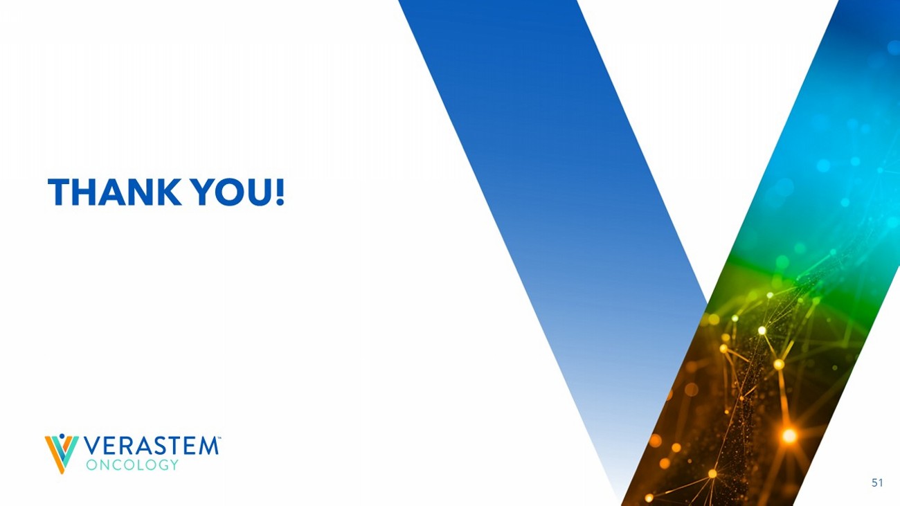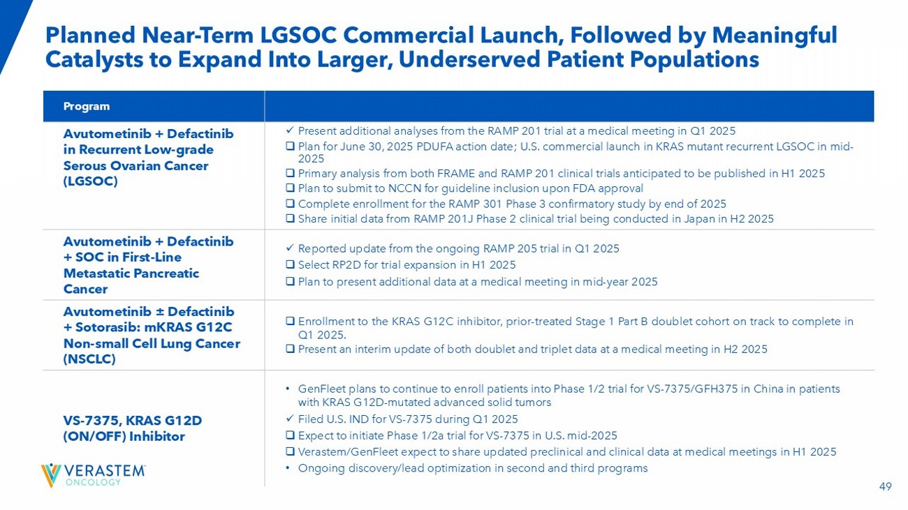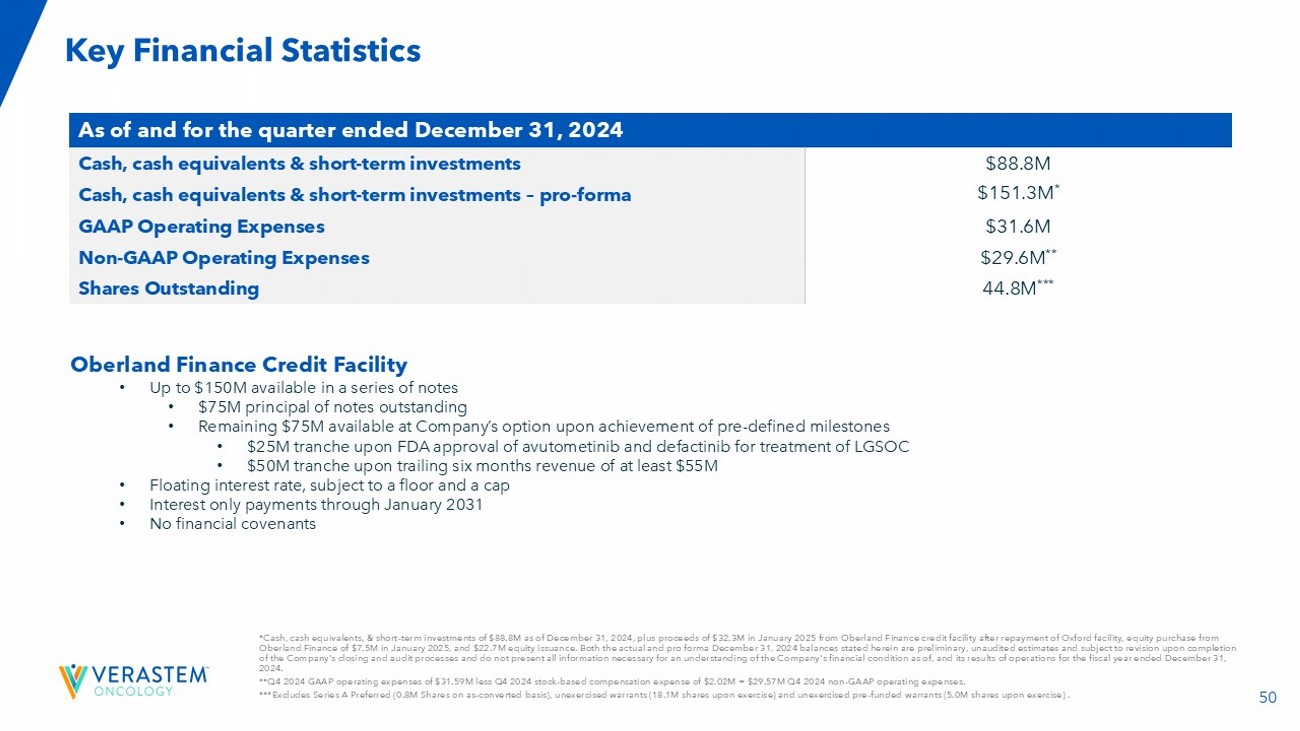 49 Planned Near - Term LGSOC Commercial Launch, Followed by Meaningful Catalysts to Expand Into Larger, Underserved Patient Populations Anticipated Milestones & Activities Program x Present additional analyses from the RAMP 201 trial at a medical meeting in Q1 2025 □ Plan for June 30, 2025 PDUFA action date ; U.S. commercial launch in KRAS mutant recurrent LGSOC in mid - 2025 □ Primary analysis from both FRAME and RAMP 201 clinical trials anticipated to be published in H1 2025 □ Plan to submit to NCCN for guideline inclusion upon FDA approval □ Complete enrollment for the RAMP 301 Phase 3 confirmatory study by end of 2025 □ Share initial data from RAMP 201J Phase 2 clinical trial being conducted in Japan in H2 2025 Avutometinib + Defactinib in Recurrent Low - grade Serous Ovarian Cancer (LGSOC) x Reported update from the ongoing RAMP 205 trial in Q1 2025 □ Select RP2D for trial expansion in H1 2025 □ Plan to present additional data at a medical meeting in mid - year 2025 Avutometinib + Defactinib + SOC in First - Line Metastatic Pancreatic Cancer □ Enrollment to the KRAS G 12 C inhibitor, prior - treated Stage 1 Part B doublet cohort on track to complete in Q 1 2025 . □ Present an interim update of both doublet and triplet data at a medical meeting in H2 2025 Avutometinib ± Defactinib + Sotorasib: mKRAS G12C Non - small Cell Lung Cancer (NSCLC) • GenFleet plans to continue to enroll patients into Phase 1/2 trial for VS - 7375/GFH375 in China in patients with KRAS G12D - mutated advanced solid tumors x Filed U.S. IND for VS - 7375 during Q1 2025 □ Expect to initiate Phase 1/2a trial for VS - 7375 in U.S. mid - 2025 □ Verastem/GenFleet expect to share updated preclinical and clinical data at medical meetings in H1 2025 • Ongoing discovery/lead optimization in second and third programs VS - 7375, KRAS G12D (ON/OFF) Inhibitor