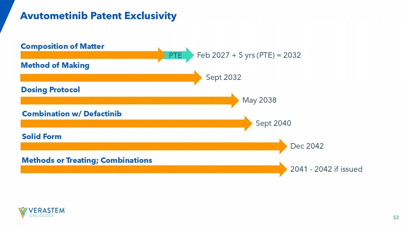 53 Avutometinib Patent Exclusivity Composition of Matter Method of Making Sept 2032 Dosing Protocol May 2038 Combination w/ Defactinib Dec 2042 Feb 2027 + 5 yrs (PTE) = 2032 Sept 2040 Solid Form PTE 2041 - 2042 if issued Methods or Treating; Combinations