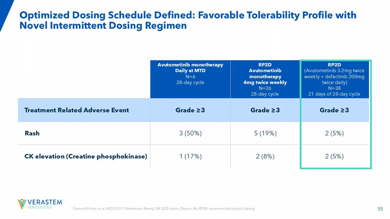 55 Optimized Dosing Schedule Defined: Favorable Tolerability Profile with Novel Intermittent Dosing Regimen RP2D (Avutometinib 3.2mg twice weekly + defactinib 200mg twice daily) N=38 21 days of 28 - day cycle RP2D Avutometinib monotherapy 4mg twice weekly N=26 28 - day cycle Avutometinib monotherapy Daily at MTD N=6 28 - day cycle Grade ≥3 Grade ≥3 Grade ≥3 Treatment Related Adverse Event 2 (5%) 5 (19%) 3 (50%) Rash 2 (5%) 2 (8%) 1 (17%) CK elevation (Creatine phosphokinase) 1 Chenard - Poirier, et al . ASCO 2017; References: Banerji, Q4 2020 report; Data on file; RP2D: recommended phase 2 dosing
