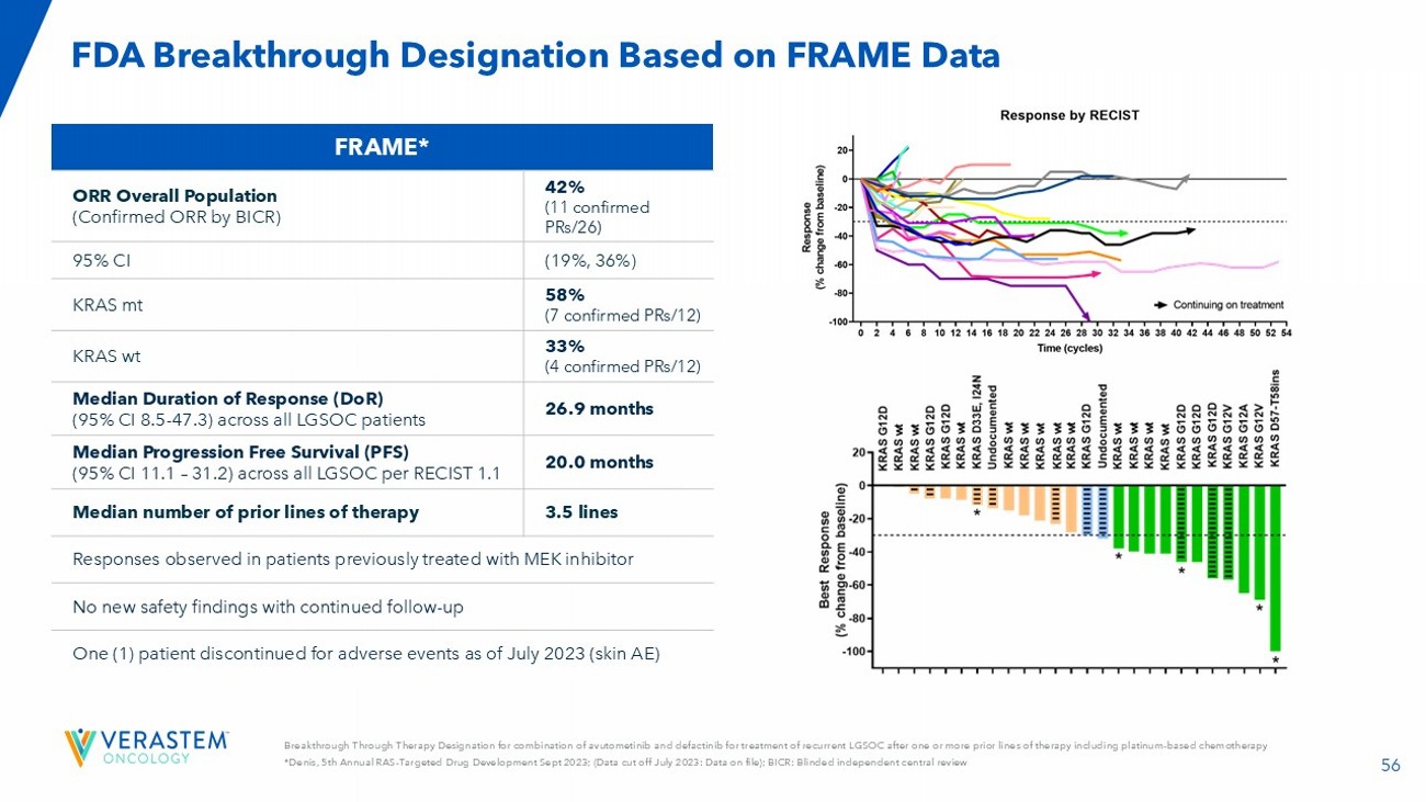 56 Breakthrough Through Therapy Designation for combination of avutometinib and defactinib for treatment of recurrent LGSOC after one or more prior lines of therapy including platinum - based chemotherapy *Denis, 5th Annual RAS - Targeted Drug Development Sept 2023; (Data cut off July 2023: Data on file); BICR: Blinded independent central review FDA Breakthrough Designation Based on FRAME Data FRAME* 42% (11 confirmed PRs/26) ORR Overall Population ​ (Confirmed ORR by BICR) (19%, 36%) 95% CI 58% (7 confirmed PRs/12) KRAS mt ​ 33% (4 confirmed PRs/12) KRAS wt ​ 26.9 months Median Duration of Response ( DoR ) (95% CI 8.5 - 47.3) across all LGSOC patients 20.0 months Median Progression Free Survival (PFS) (95% CI 11.1 – 31.2) across all LGSOC per RECIST 1.1 3.5 lines Median number of prior lines of therapy Responses observed in patients previously treated with MEK inhibitor No new safety findings with continued follow - up One (1) patient discontinued for adverse events as of July 2023 (skin AE)